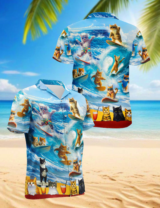 Netecom Cat Surfing Hawaiian Shirt for Men, Button D...