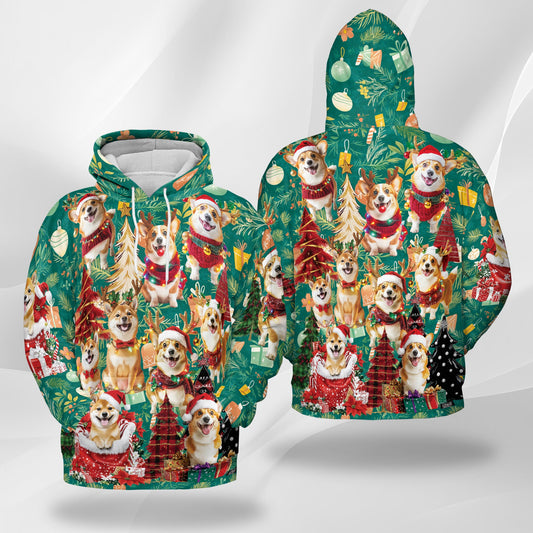 Netecom Christmas Corgi Print Hoodie with Front Pock...