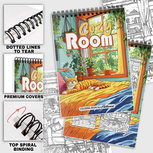 NETHOUSE Cozy Room Spiral Coloring Book for Adults Relaxation & Stress Relief, 30 Coloring Pages of Cozy Living Spaces, Indoor Plants, and Relaxing Home Decor.