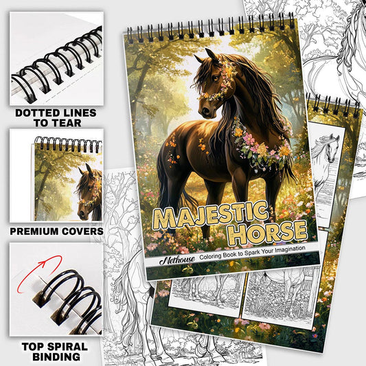 NETHOUSE Majestic Horse Spiral Coloring Book for Adults Relaxation & Stress Relief, 30 Coloring Pages of Graceful Horses, Scenic Landscapes, and Elegant Equestrian Art.