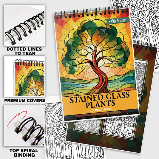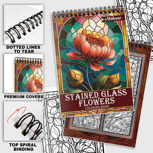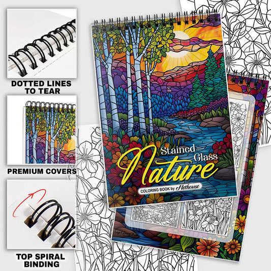 NETHOUSE Stained Glass Nature Spiral Coloring Book for Adults Relaxation & Stress Relief, 30 Coloring Pages of Stunning Stained Glass Nature Scenes, Vibrant Landscapes, and Elegant Floral Designs.