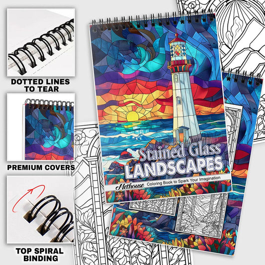 NETHOUSE Stained Glass Landscapes Spiral Coloring Book for Adults Relaxation & Stress Relief, 30 Coloring Pages of Stained Glass Landscapes, Nature Views, and Colorful Designs