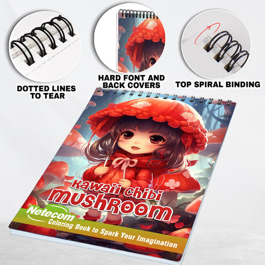 Kawaii Chibi Mushroom Spiral Bound Coloring Book, Embark on a Coloring Journey with 30 Kawaii Chibi Mushroom Designs
