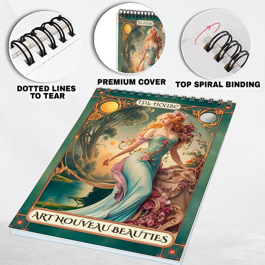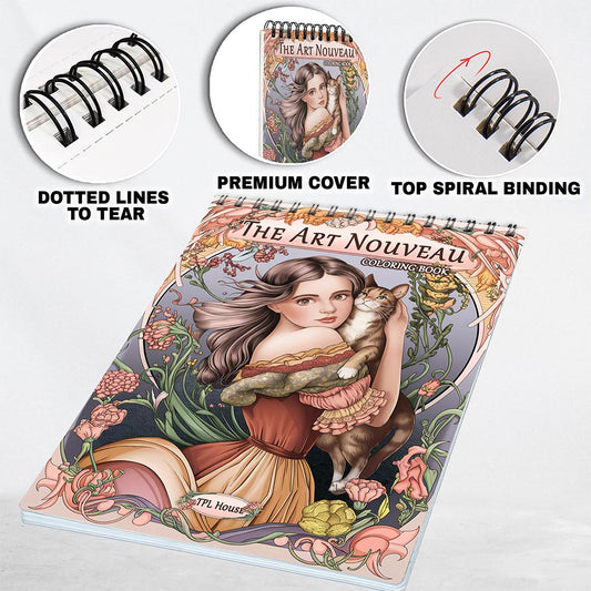 TPLHOUSE Art Nouveau Beauties Spiral Coloring Book for Adults Relaxation & Stress Relief, 30 Coloring Pages of Elegant Art Nouveau Beauties, Ornate Patterns, and Timeless Floral Designs.