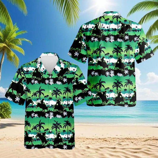 Netecom Green Bull Riding Palm Tree Hawaiian Shirt f...