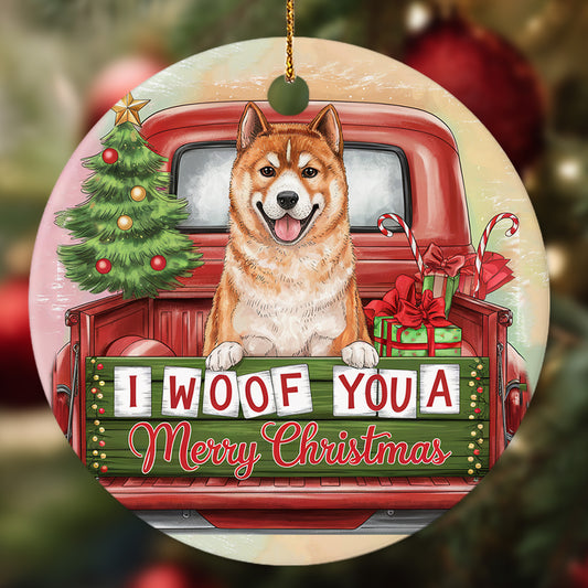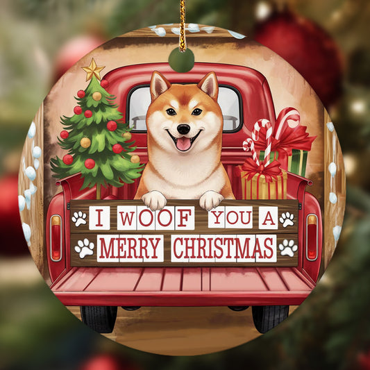 Netecom Cute Shiba Inu in Holiday Truck Ornament, I Woof You a Merry Christmas Ceramic Ornament for Christmas Tree Hanging Decorations Gift, Dog Lover Gifts, Holiday Decor Present