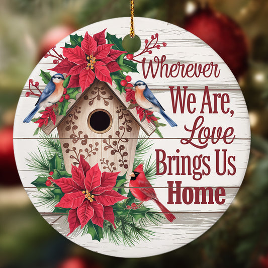 Netecom Classic Birdhouse Ornament with Red Poinsettia and Birds, Wherever We Are Love Brings Us Home Ceramic Ornament for Christmas Tree Hanging Decorations Gift, Home Decor, Holiday Present