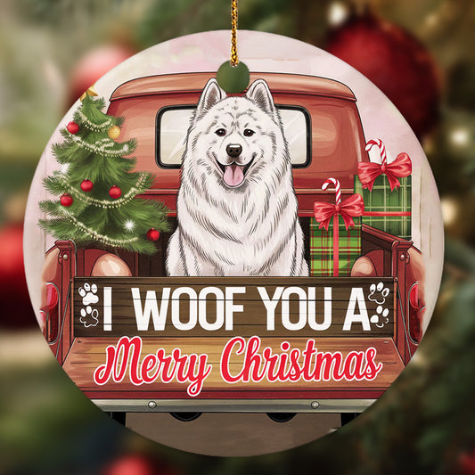 Netecom Cute Samoyed in Holiday Truck Ornament, I Woof You a Merry Christmas Ceramic Ornament for Christmas Tree Hanging Decorations Gift, Pet Lover Gifts, Holiday Decor Present