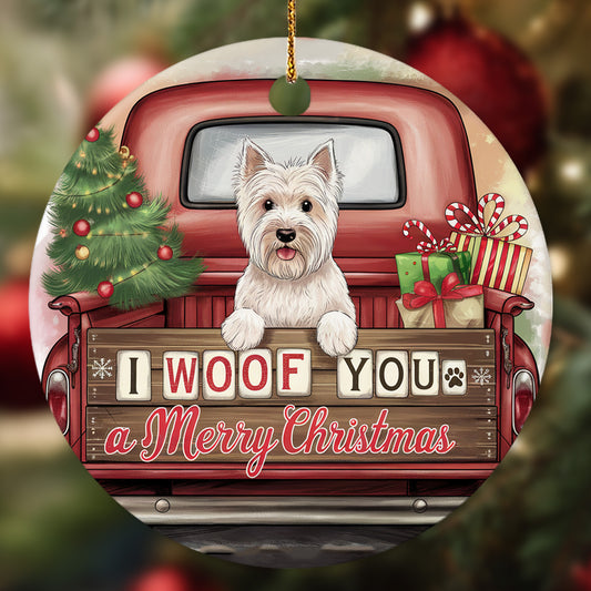 Netecom Cute Westie Puppy in Holiday Truck Ornament, I Woof You a Merry Christmas Ceramic Ornament for Christmas Tree Hanging Decorations Gift, Pet Lover Gifts, Holiday Decor Present