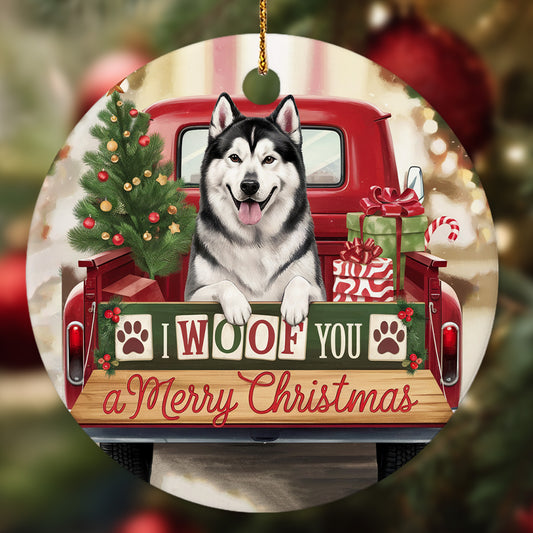 Netecom Funny Alaskan Malamute in Red Truck Ornament, I Woof You a Merry Christmas Ceramic Ornament for Christmas Tree Hanging Decorations Gift, Dog Lover Gifts, Holiday Party Present