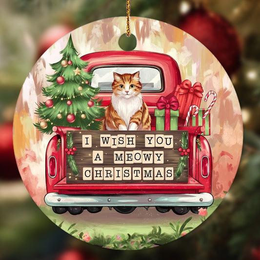 Netecom Cute Cat in Holiday Truck Ornament, I Wish You a Meowy Christmas Ceramic Ornament for Christmas Tree Hanging Decorations Gift, Kitten Lover Gifts, Holiday Party Present