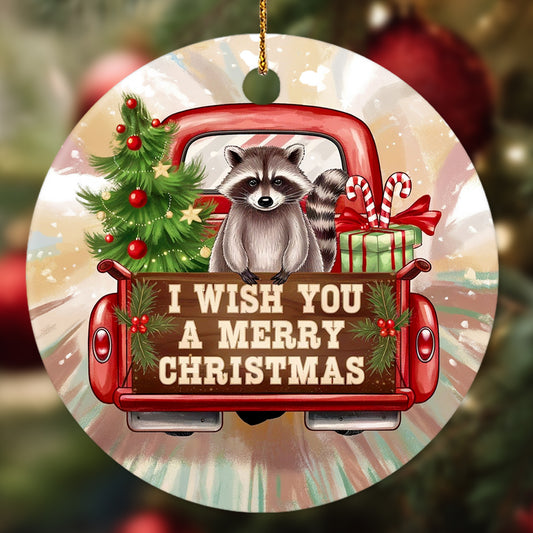 Netecom Adorable Raccoon in Vintage Pickup Truck Ornament, I Wish You Merry Christmas Ceramic Ornament for Christmas Tree Hanging Decorations Gift, Wildlife Lover Gifts, Xmas Decoration Present
