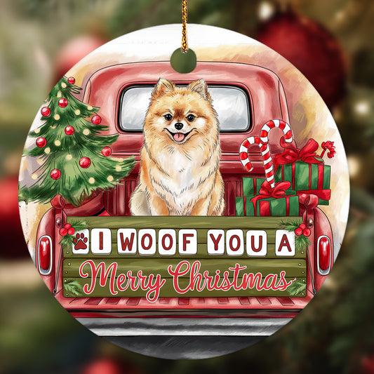 Netecom Cute Pomeranian Dog in Red Truck Ornament, I Woof You a Merry Christmas Ceramic Ornament for Christmas Tree Hanging Decorations Gift, Dog Lover Gifts, Holiday Party Present
