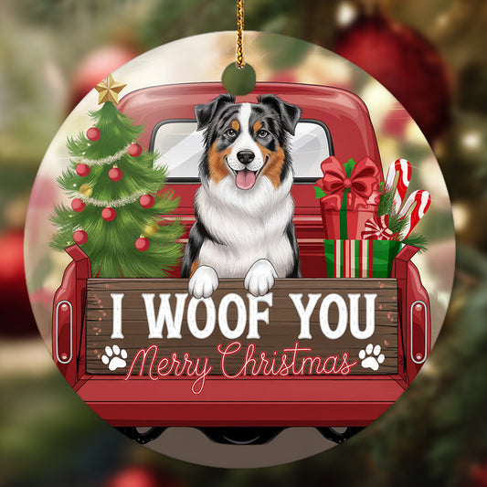 Netecom Cute Australian Shepherd in Holiday Truck Ornament, I Woof You Merry Christmas Ceramic Ornament for Christmas Tree Hanging Decorations Gift, Pet Lover Gifts, Holiday Decor Present