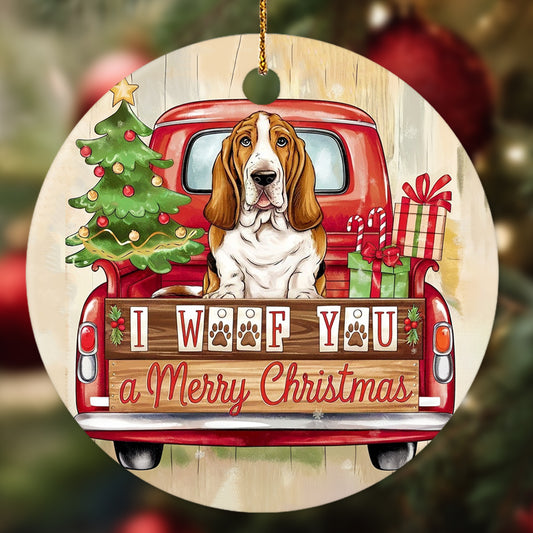 Netecom Funny Basset Hound in Holiday Truck Ornament, I Woof You a Merry Christmas Ceramic Ornament for Christmas Tree Hanging Decorations Gift, Pet Lover Gifts, Holiday Party Present