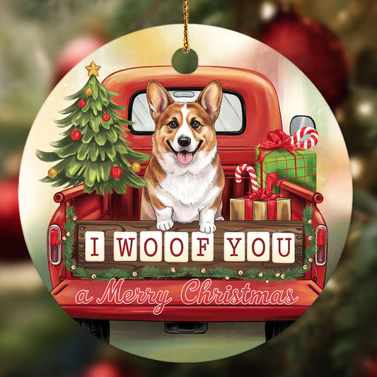 Netecom Cute Corgi in Holiday Truck Ornament, I Woof You a Merry Christmas Ceramic Ornament for Christmas Tree Hanging Decorations Gift, Puppy Lover Gifts, Holiday Party Present