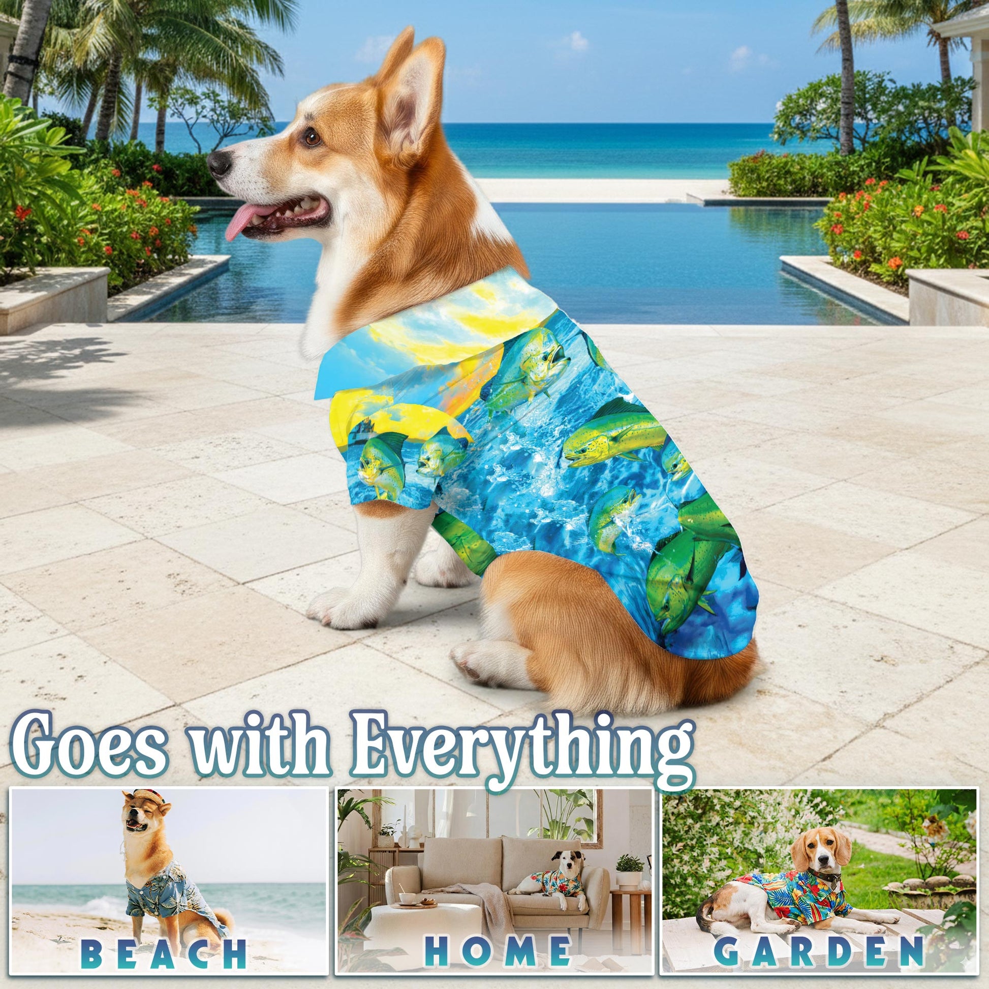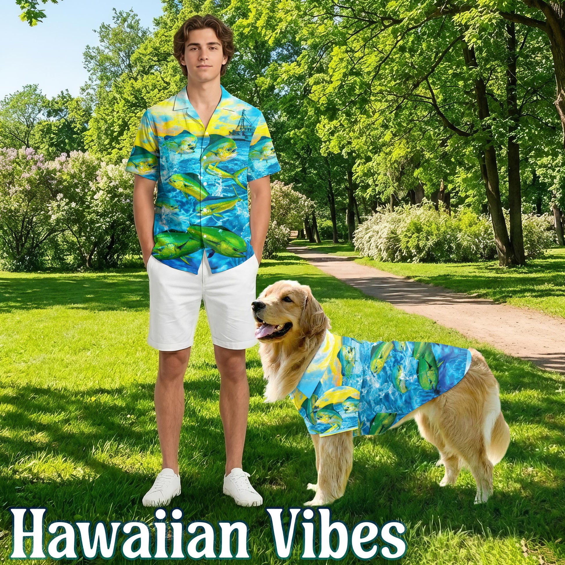 Netecom Matching Mahi-Mahi Fish Fishing Hawaiian Shirt for Dog and Owner, Aloha Summer Shirt, Ocean Fish Print Outfit for Pet and Human, Beach Vacation Casual Wear