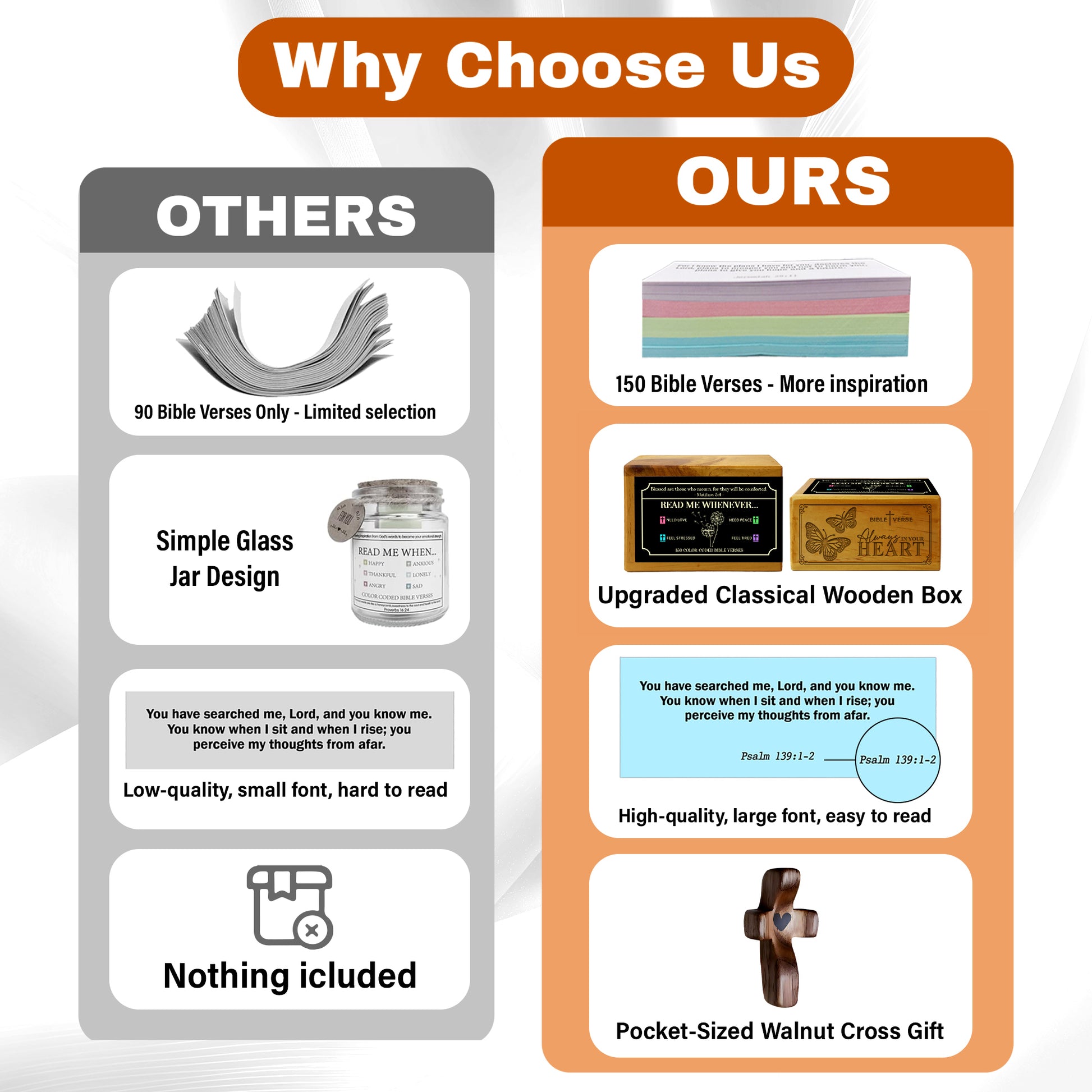 Includes: Pine wood box, 150 Bible verse cards, walnut cross