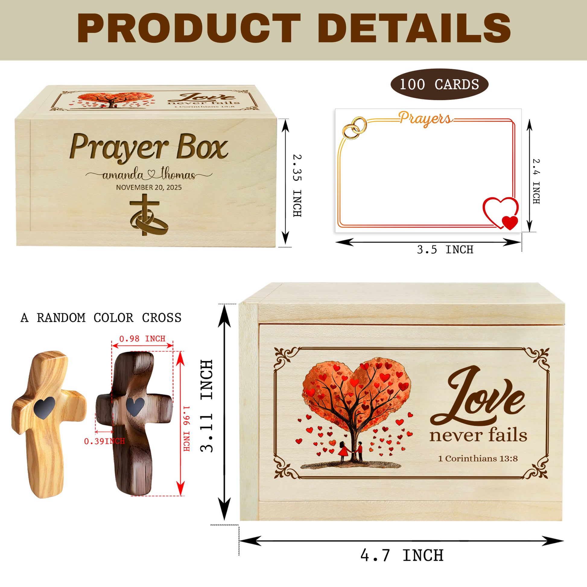 Netecom Personalized Couple Prayer Box with 100 Prayer Request Cards and Handheld Cross – Custom Names and Anniversary Date, Wooden Christian Gift for Couples