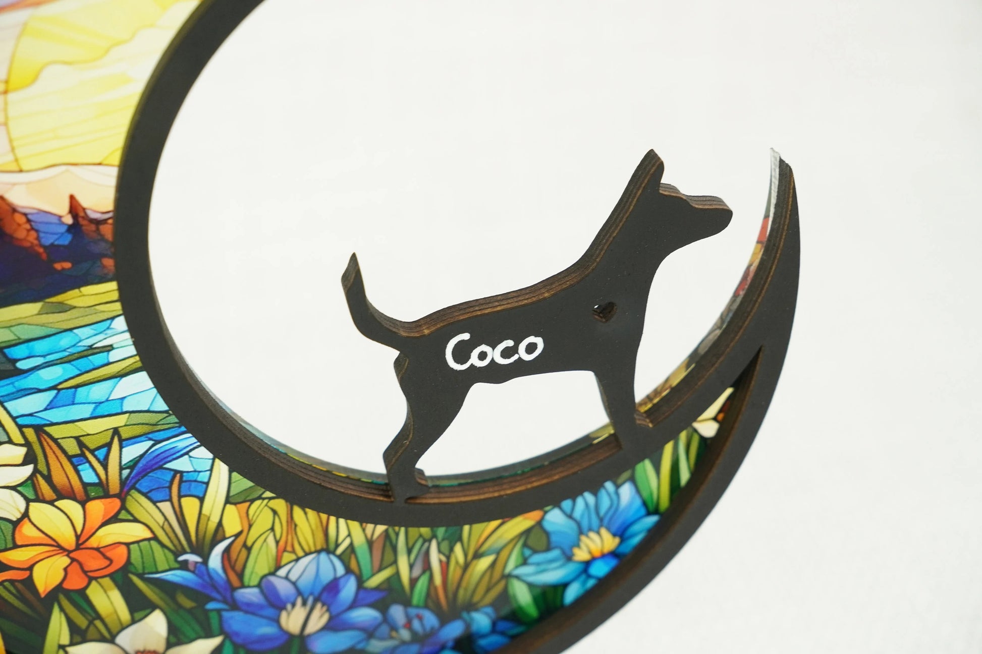 Honor the memory of your cherished dog with this beautifully crafted wooden memorial suncatcher, designed to offer comfort and warmth during moments of loss. Made from high-quality wood with detailed engraved artwork, this keepsake serves as a meaningful tribute to the love and joy your furry friend brought into your life.