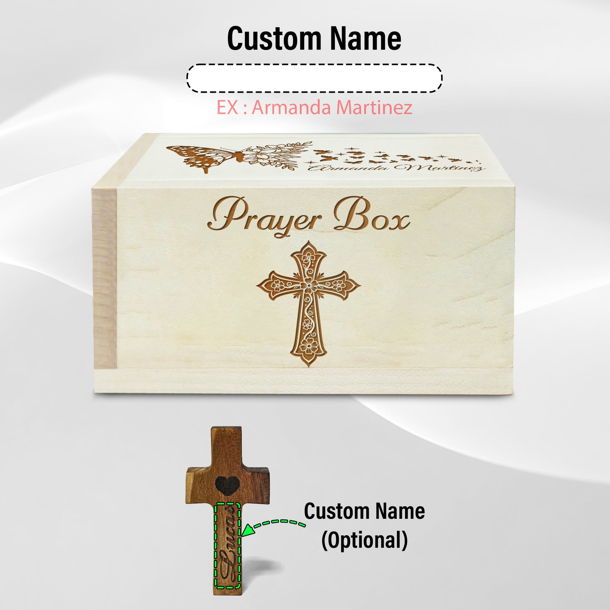 This personalized wooden prayer box set offers a thoughtful way to write down prayers, intentions, and moments of gratitude—then gently place them into God’s hands. The included custom name engraved wooden cross adds a personal touch, turning this set into a meaningful religious keepsake.