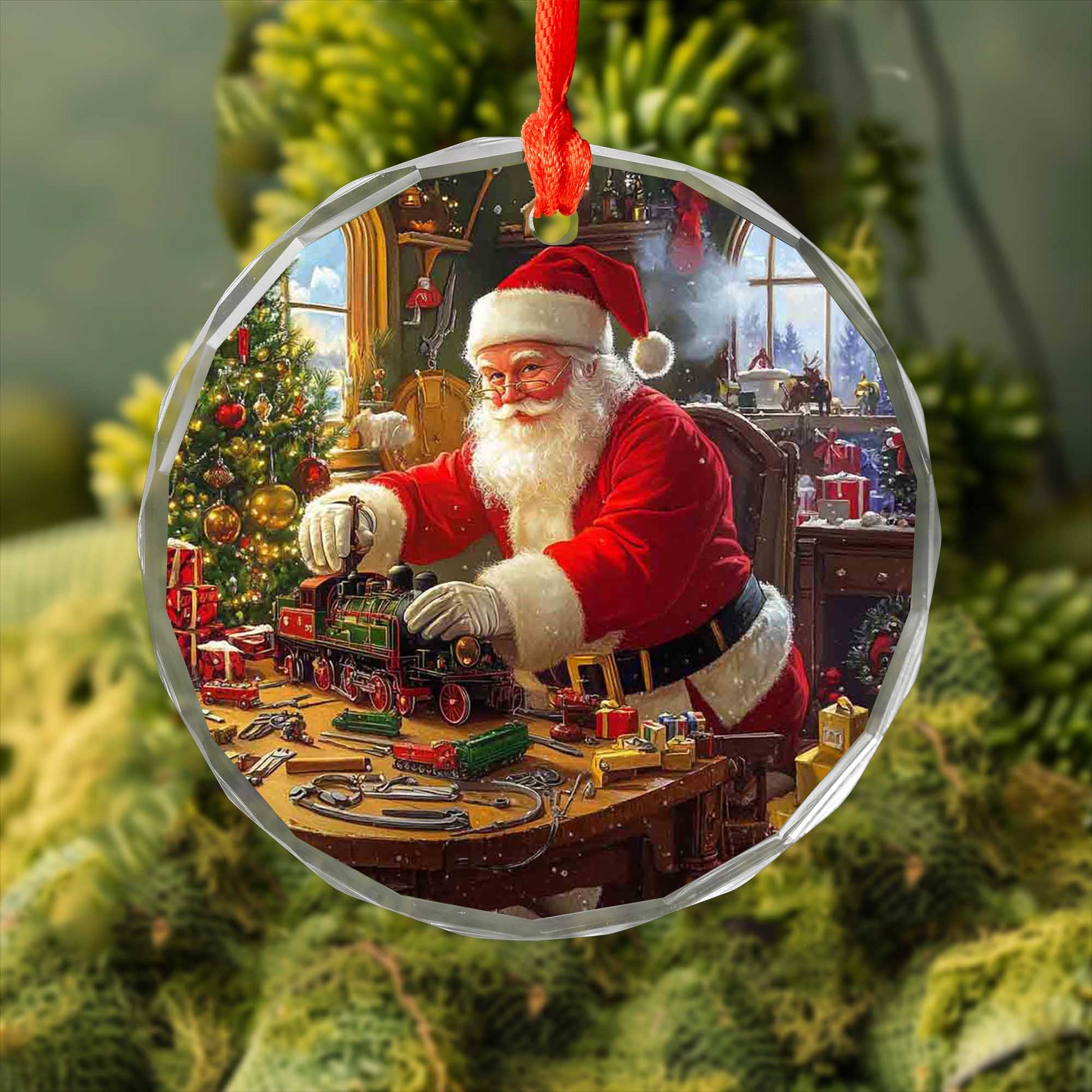 Netecom Santa Claus Perfecting Toy Train Glass Ornament – Master Toymaker Workshop Scene, Holiday Keepsake Gift, 3-inch