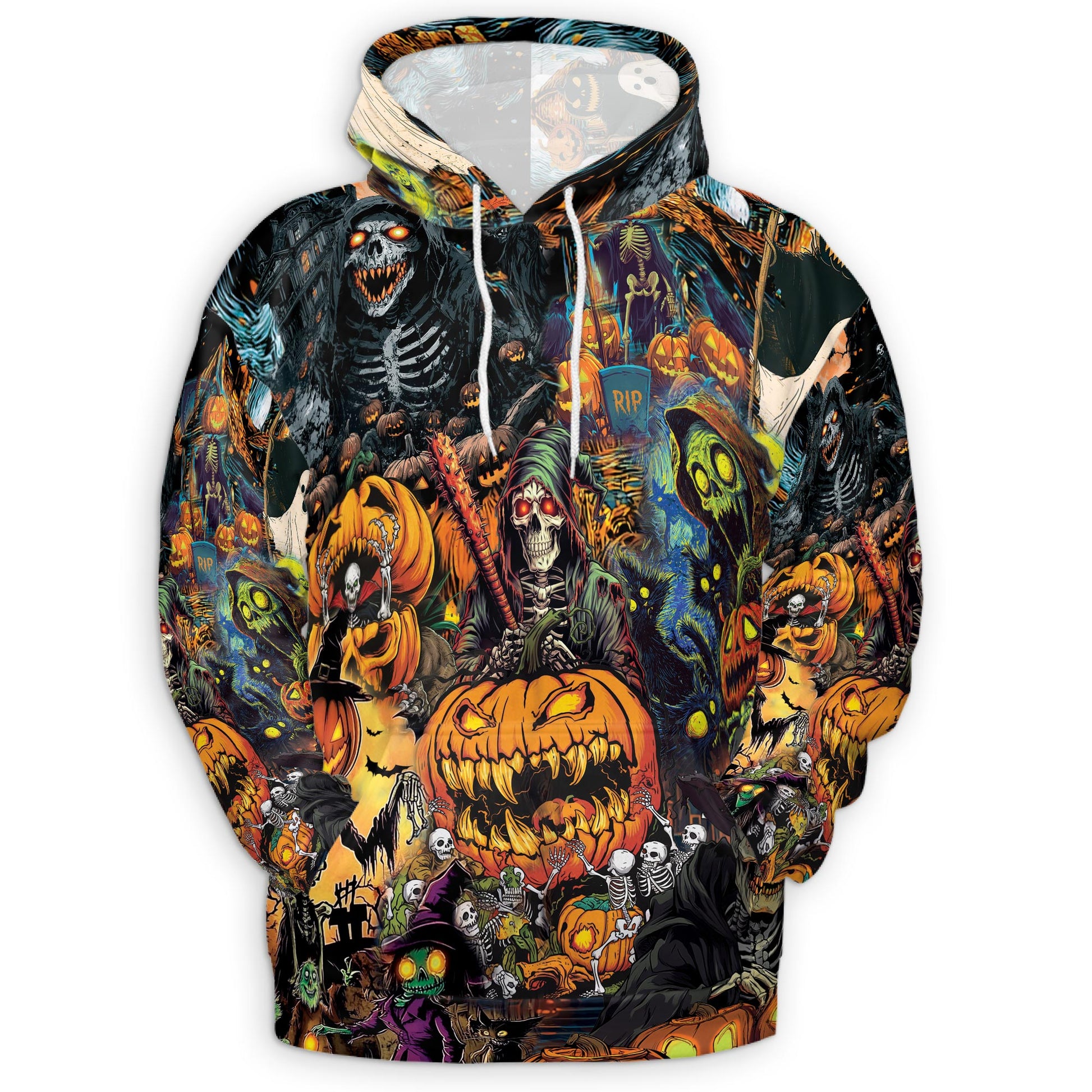 Netecom Spooky Skeleton Halloween 3D Hoodie with Front Pocket, Unisex Casual All Over Pumpkin Graphic Sweatshirt