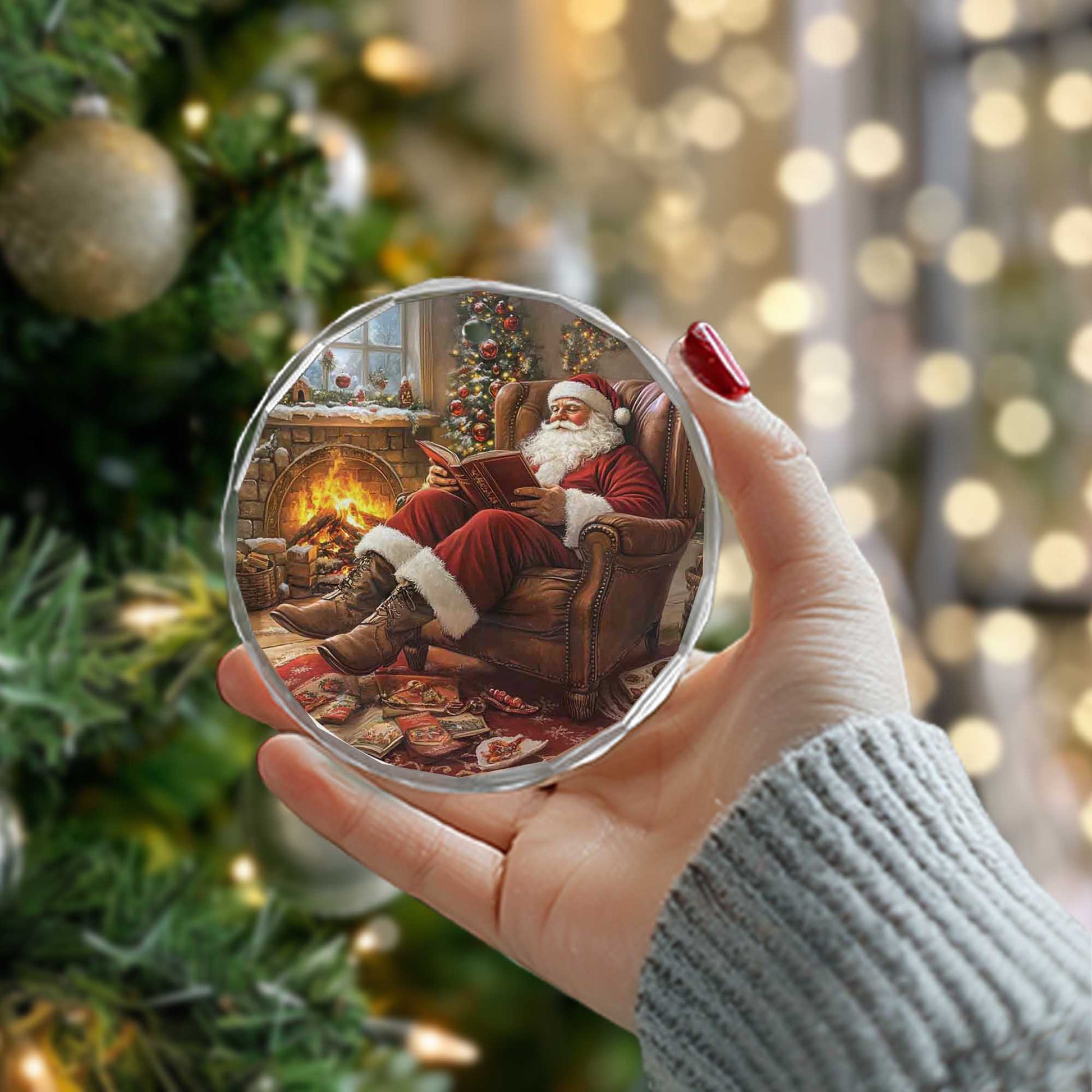 Netecom Cozy Santa Reading Christmas Story Glass Ornament – Fireplace Armchair Scene, Holiday Keepsake Gift, 3-inch