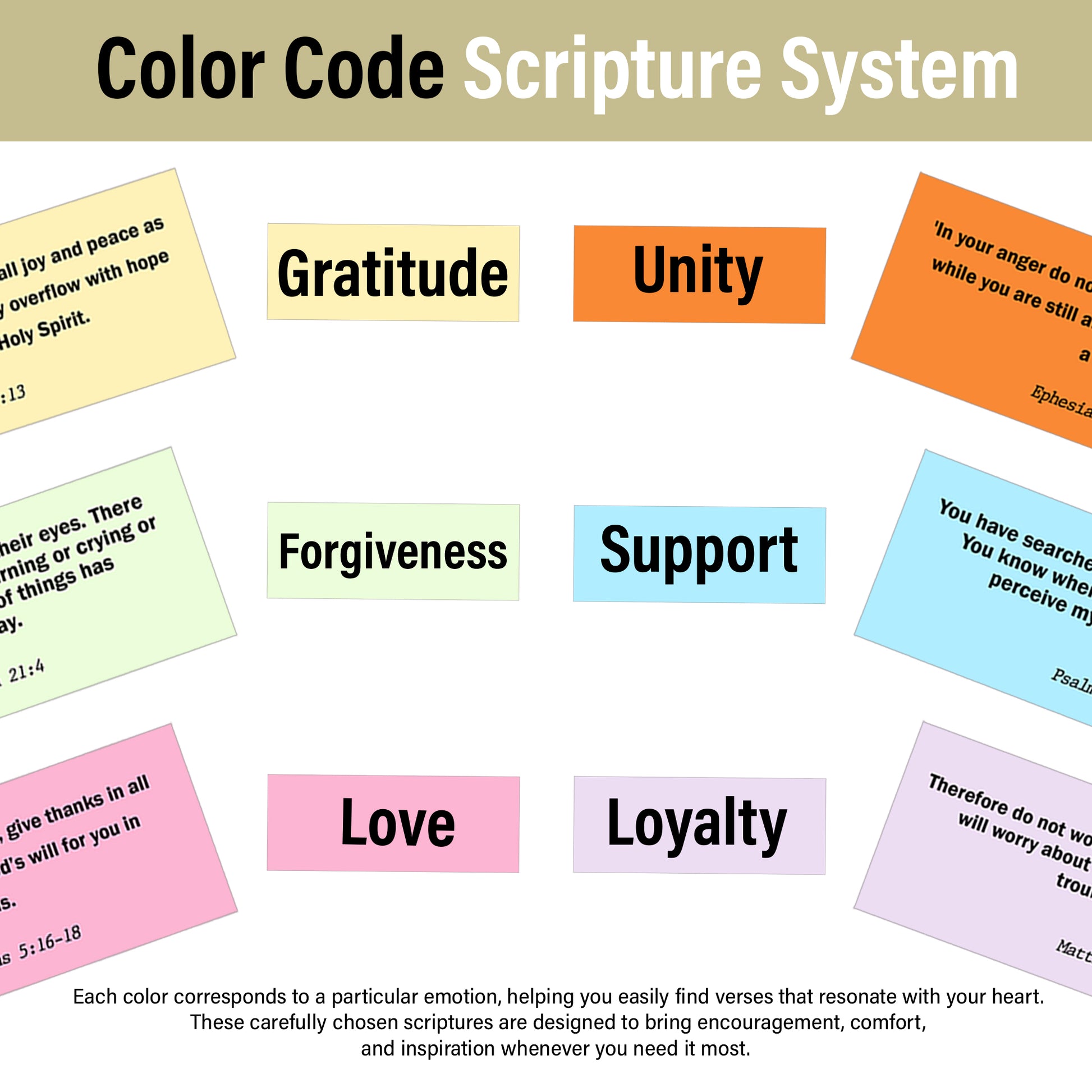 Color-Coded Emotional Guidance: The scripture cards are thoughtfully color-coded into six emotions—Love, Gratitude, Forgiveness, Support, Unity, and Loyalty—allowing you to easily find the perfect verse for any moment.