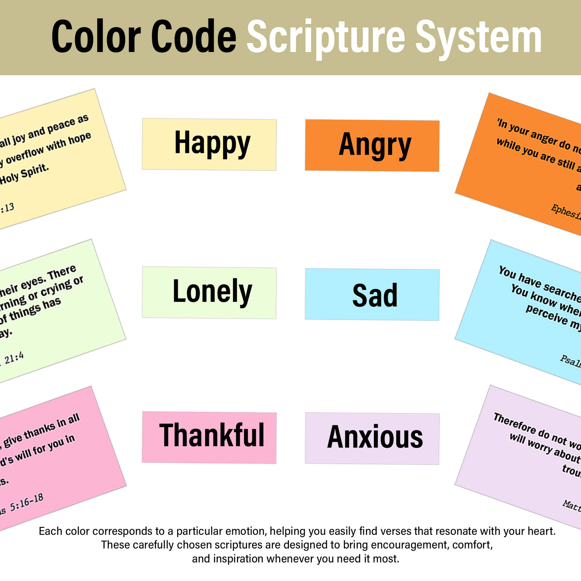 Emotion-Based Guidance: The verses are color-coded into six emotions - Happy, Thankful, Anxious, Lonely, Angry, and Sad, helping you find the right words to reflect on your emotions when you need them the most.