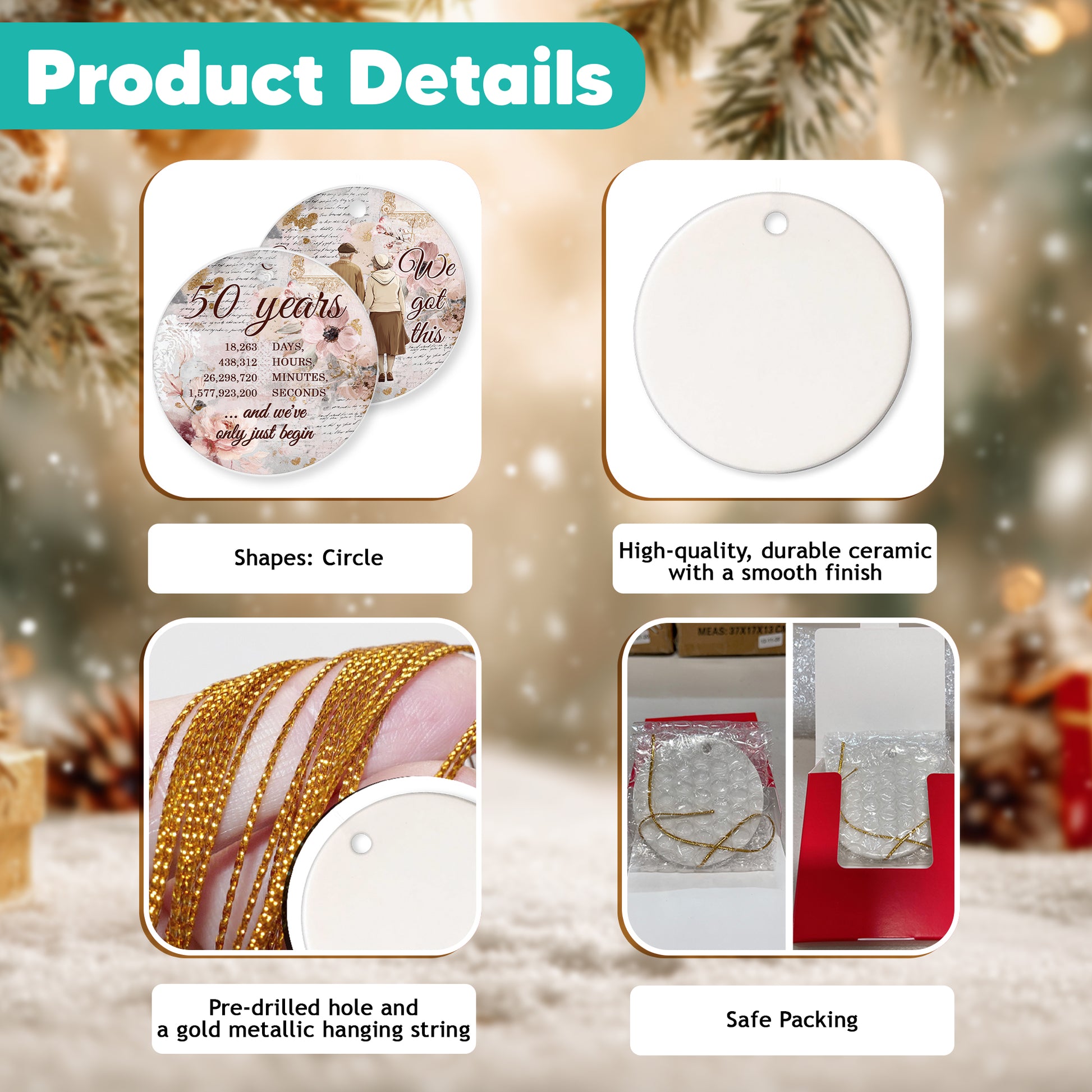 Netecom 50th Anniversary Ornament, 50th Wedding Ornaments Ceramic for Xmas Tree Hanging Decorations Gift, Gifts for Couple Husband Wife, Home Decor