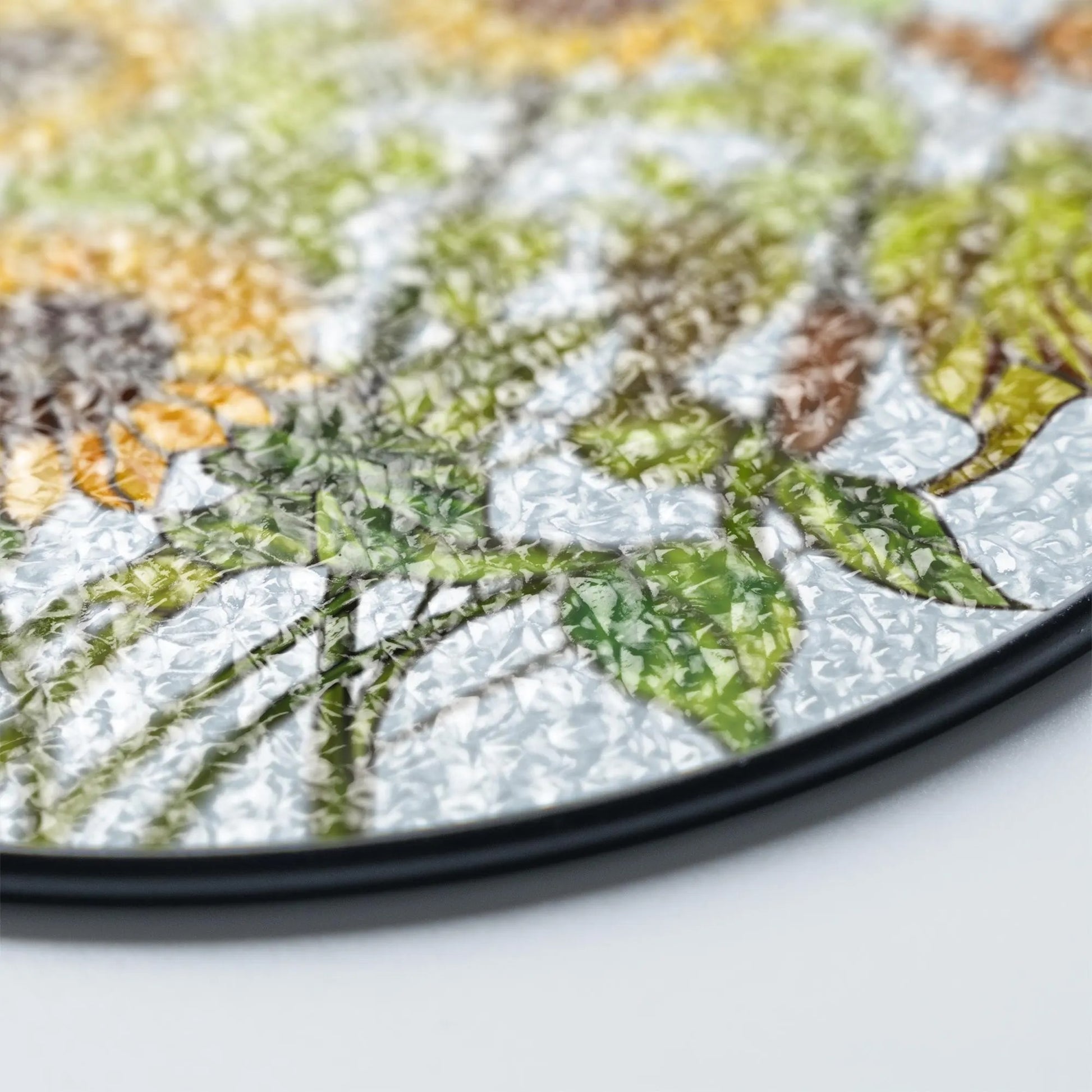 Add a touch of nature and vibrant color to your space with this 8" Sunflower Stained Glass Suncatcher. Featuring cheerful sunflowers, butterflies, and rich green leaves, this round stained-glass window hanging creates dazzling reflections when the sunlight filters through. It’s the perfect piece for brightening up your kitchen, living room, or sunroom with a pop of floral elegance.