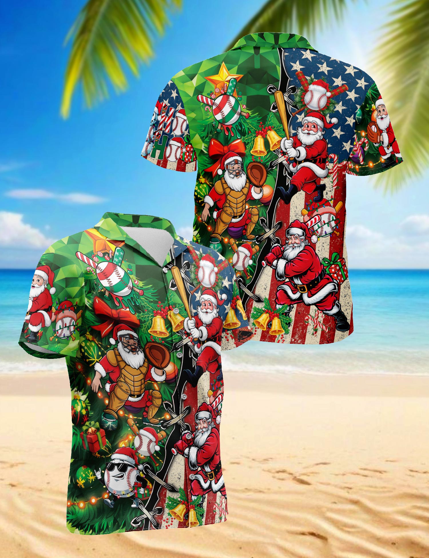 Netecom Baseball Santa USA Flag Christmas Hawaiian Shirt for Men, Funny Holiday Sport Button Down Summer Beach Shirt, S-5XL