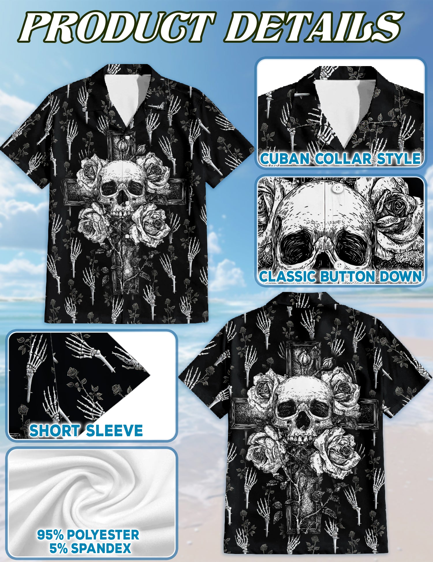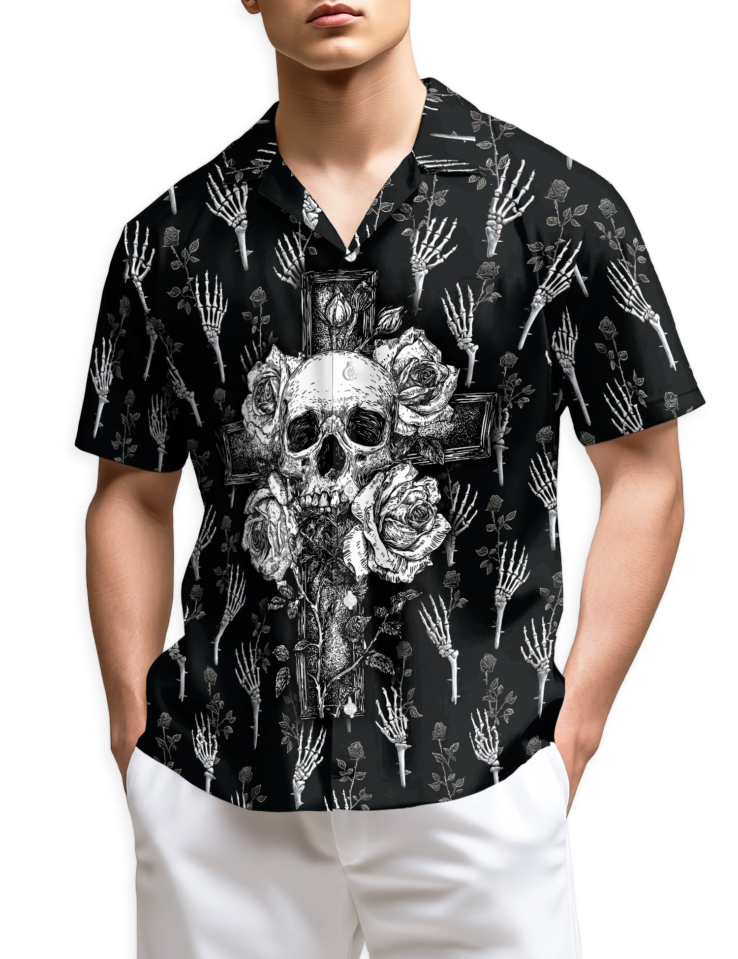 Netecom Black And White Skull Roses Hawaiian Shirt for Men, Skeleton Hand Flower Print Button Down Summer Beach Shirts