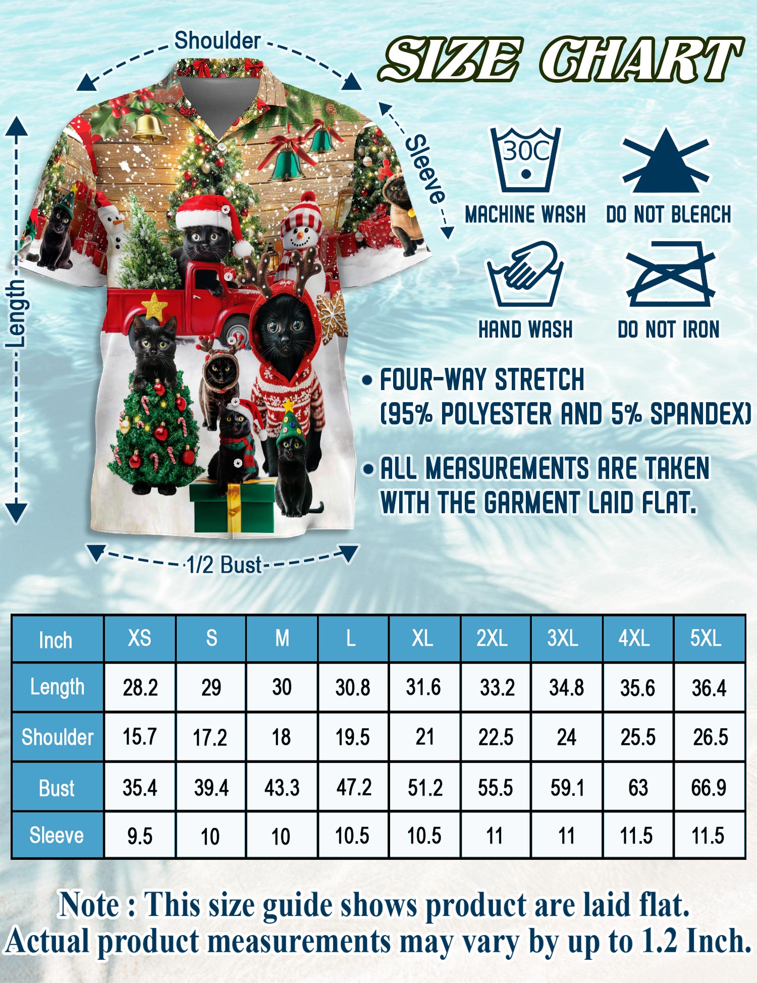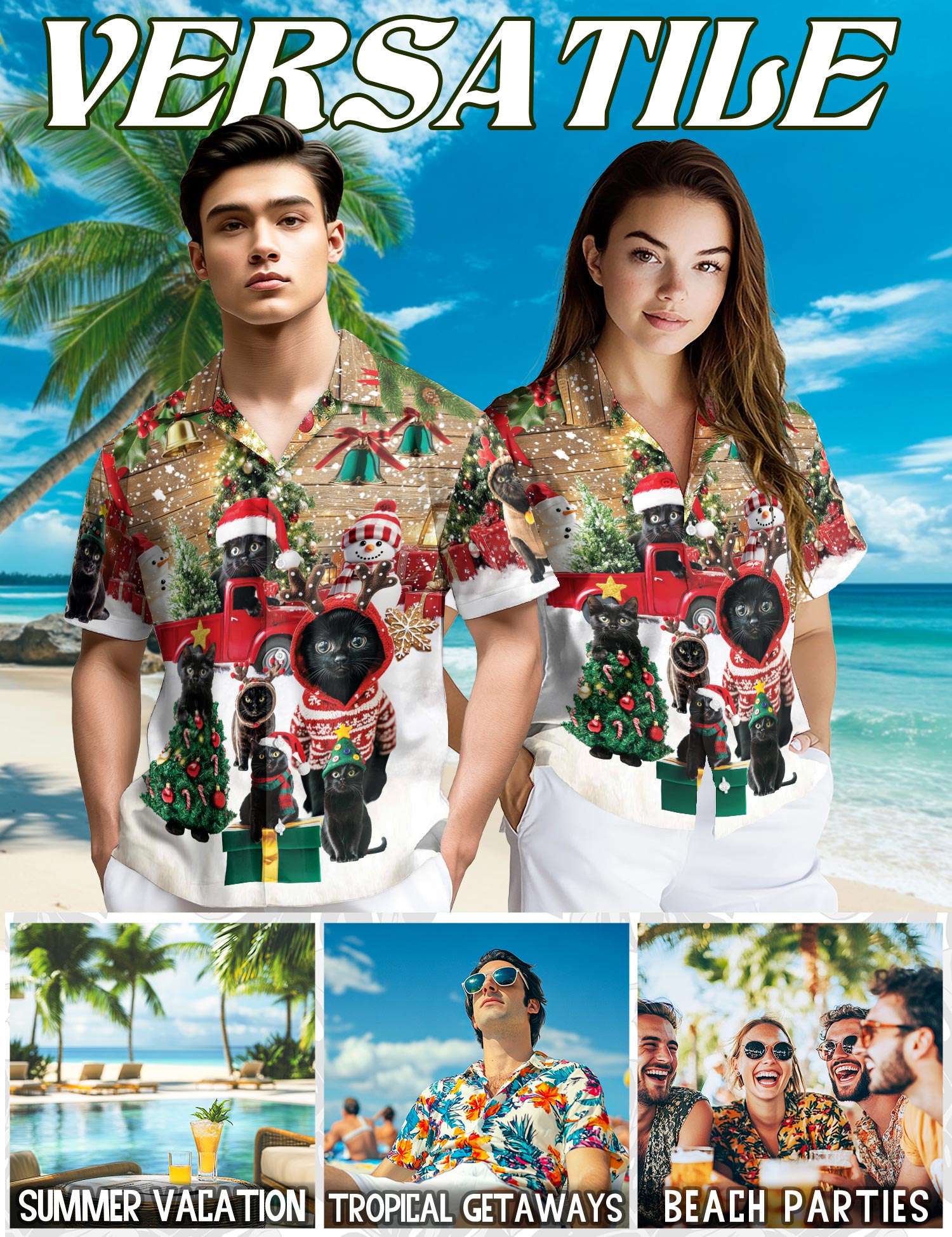 Netecom Black Cat Christmas Hawaiian Shirt for Men, Funny Holiday Kitten in Santa Hat Button Down Shirt, S-5XL
