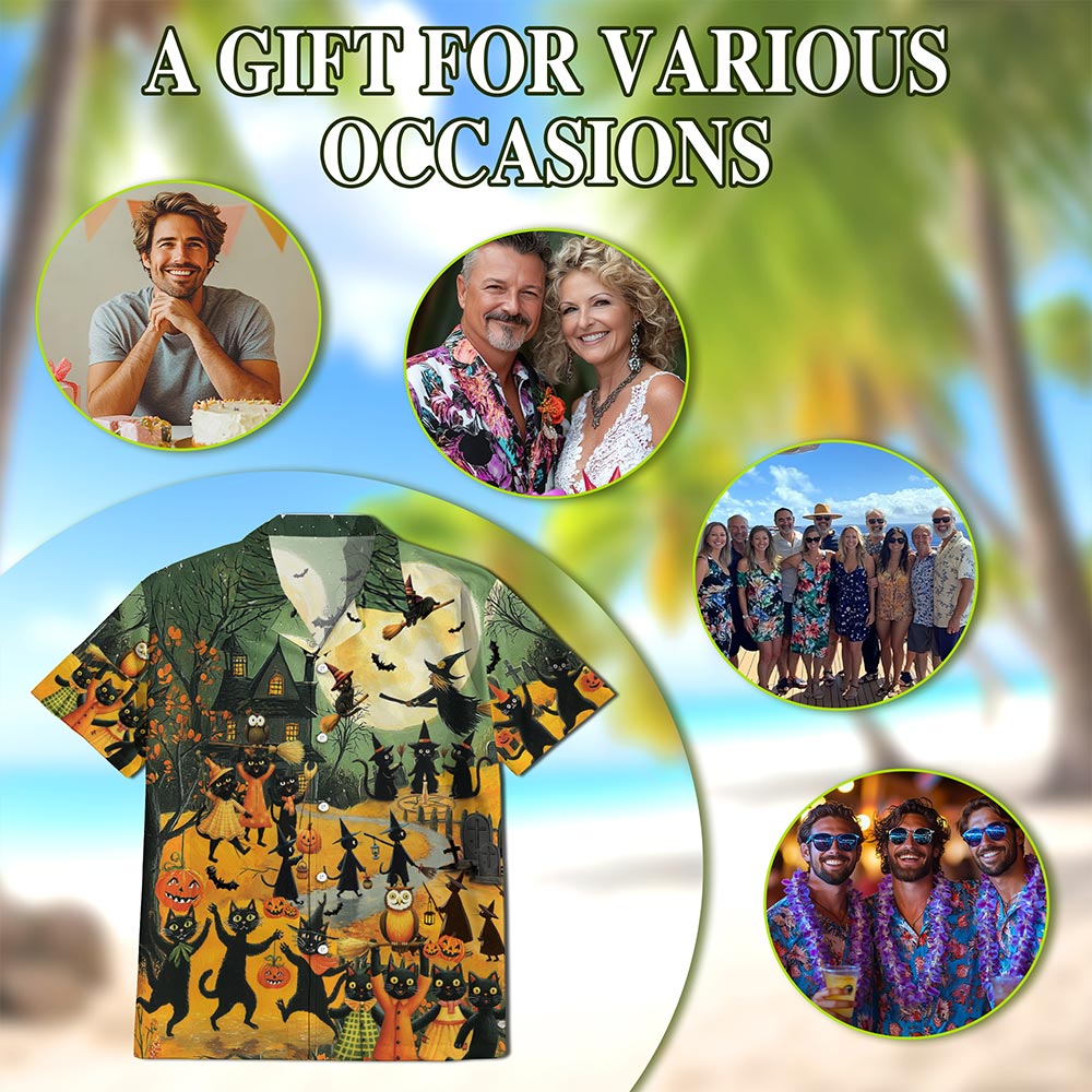 Netecom Black Cat Hawaiian Shirt for Men, Halloween Present, Animal Pumpkin Button Down Summer Beach Shirts, S-5XL