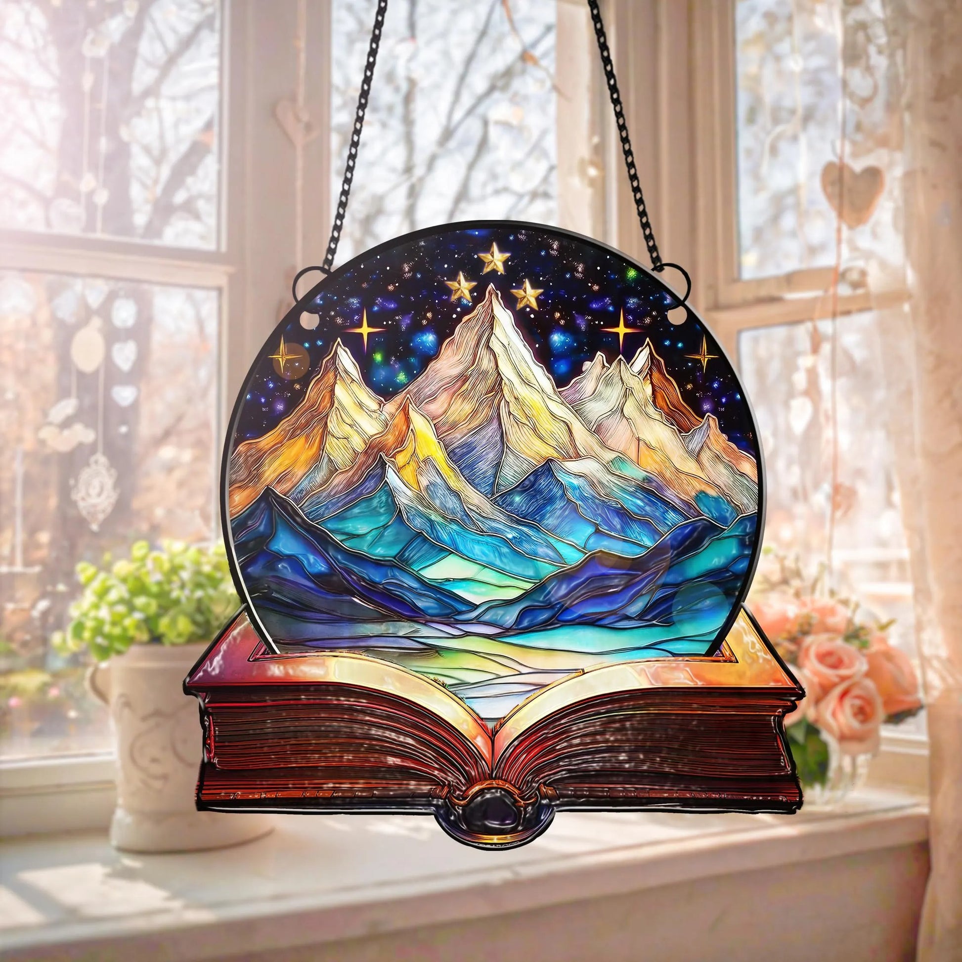 Hang it in a bright window and watch your love for stories transform into a beautiful glow!