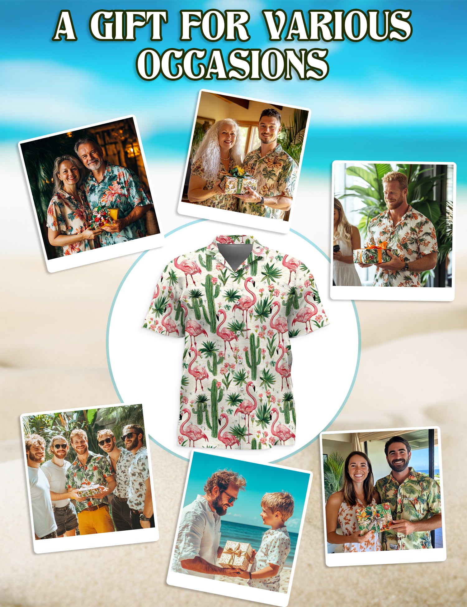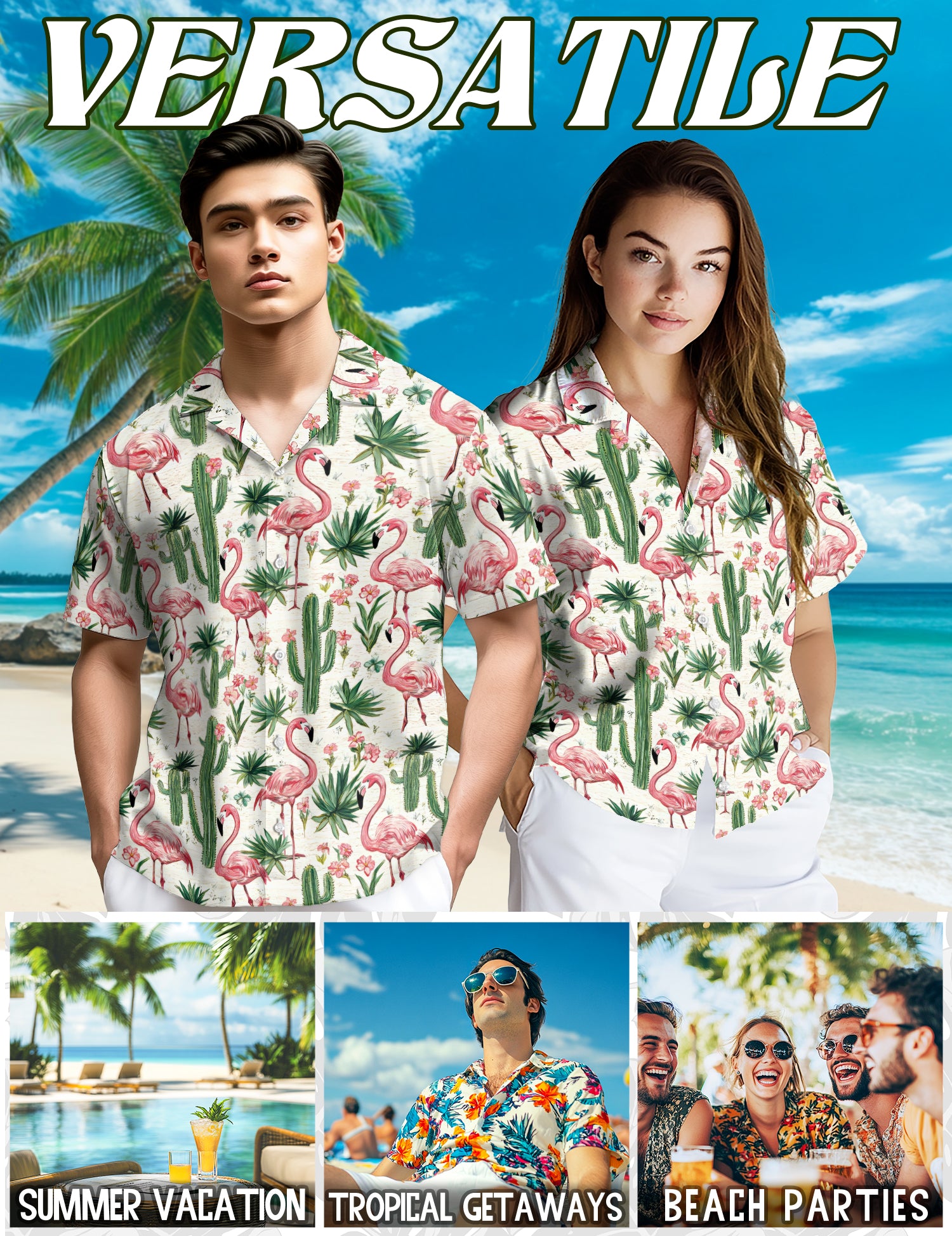 Netecom Cactus Flamingo Hawaiian Shirt for Men, Bird Lover Gifts, Tropical Animal Button Down Summer Beach Shirts
