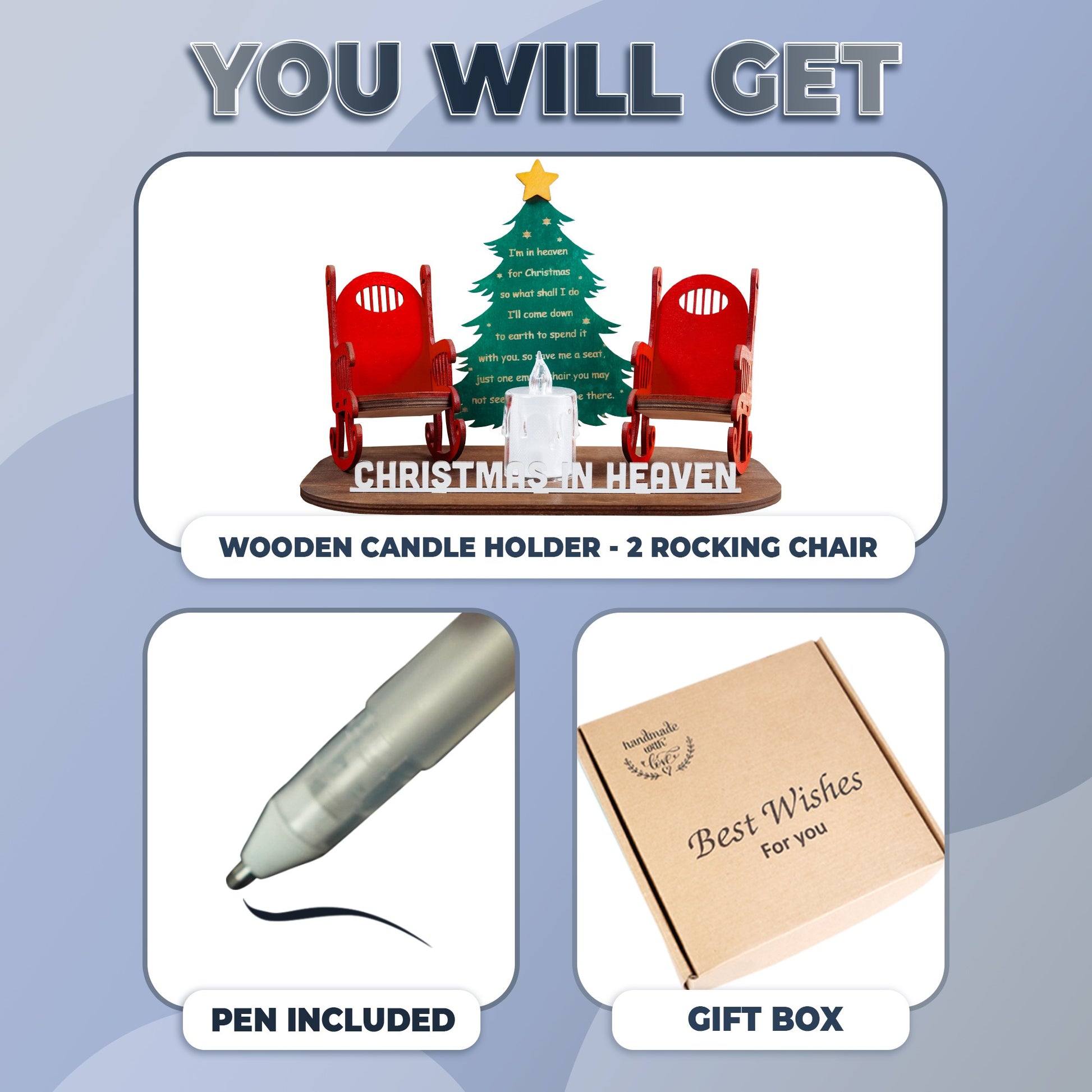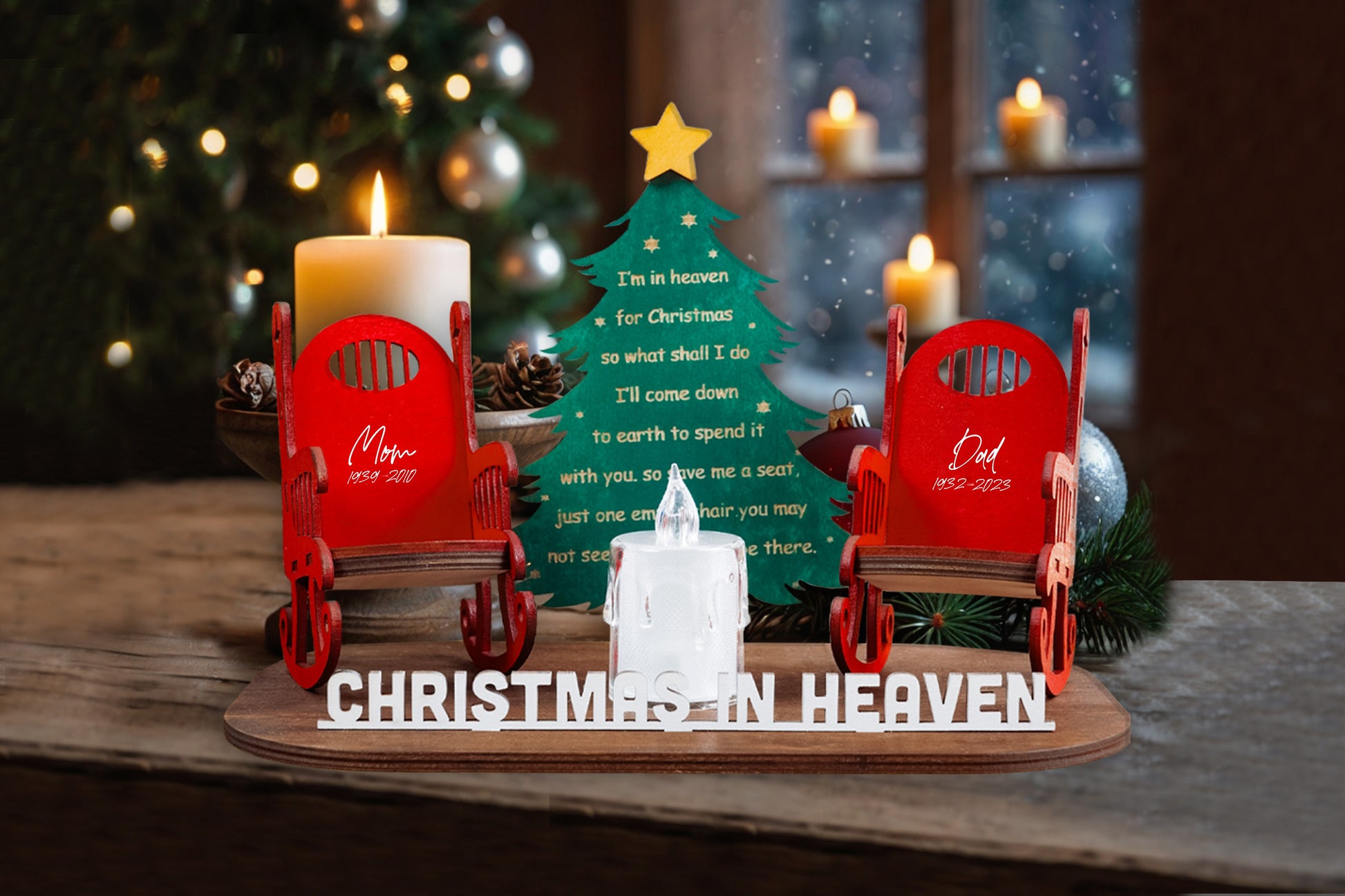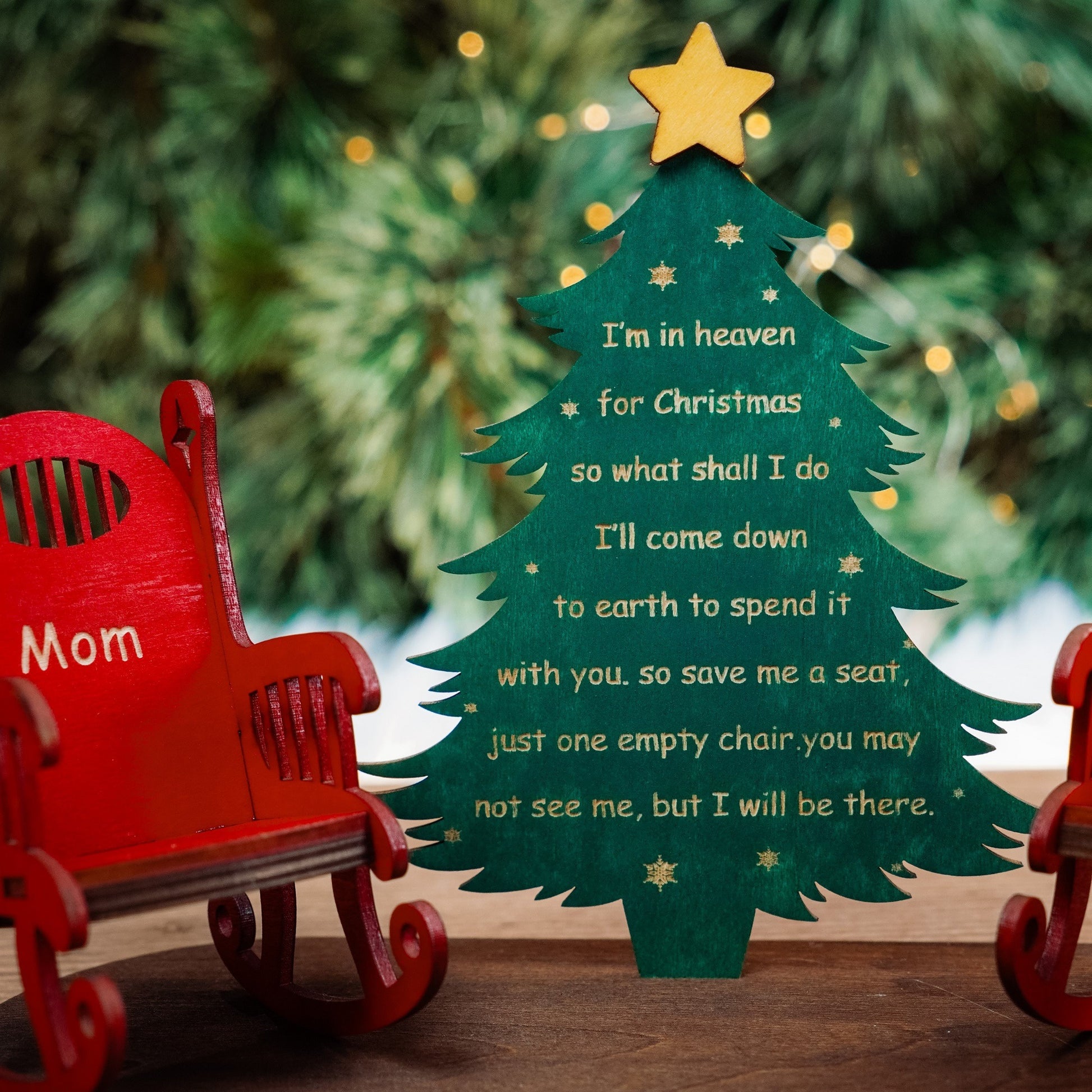 Comforting Scene: Features a wooden Christmas tree engraved with a touching "Christmas in Heaven" poem (or verse) and two empty red rocking chairs labeled "Mom" and "Dad."