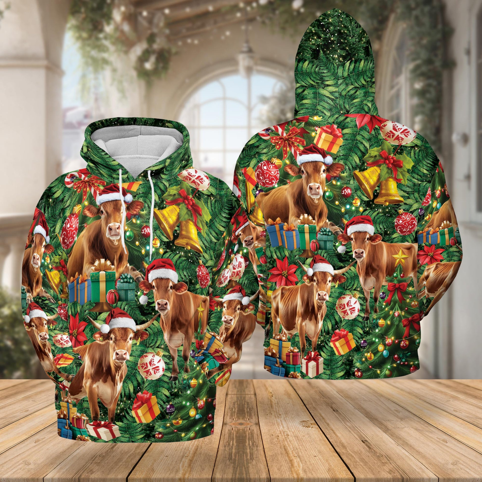 Netecom Christmas Cow 3D Hoodie with Front Pocket, Unisex Casual All Over Santa Hat Farm Animal Graphic Sweatshirt