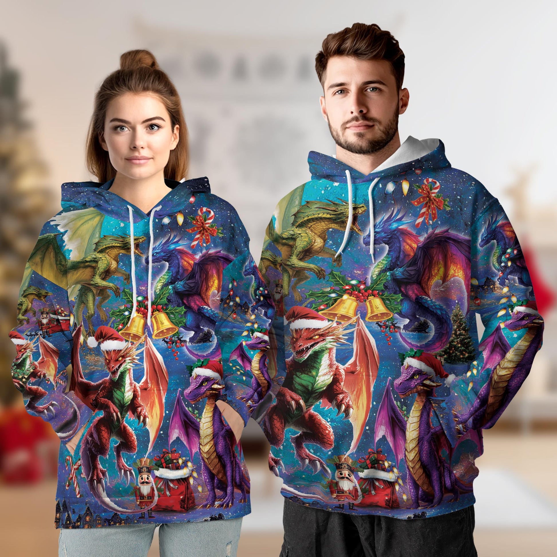 Netecom Christmas Dragon Print Hoodie with Front Pocket, All Over Fantasy Fire Dragon Graphic Sweatshirt Unisex Casual