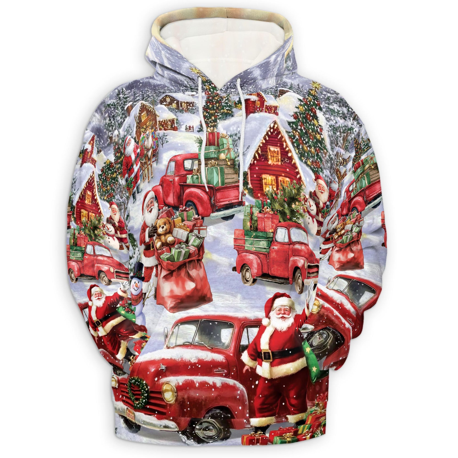 Netecom Christmas Red Truck 3D Hoodie with Front Pocket, Unisex Casual All Over Santa Claus Snow Graphic Sweatshirt