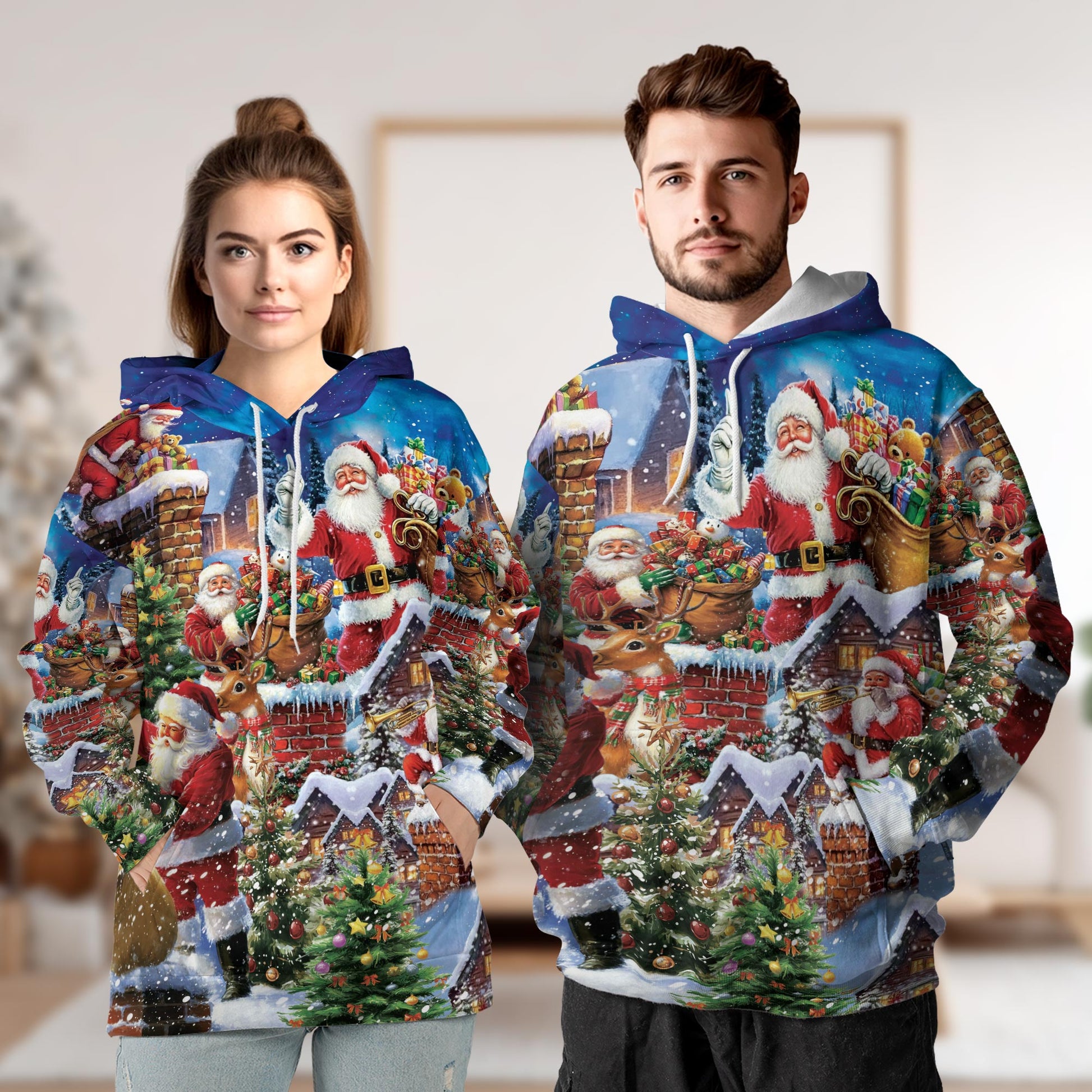 Netecom Christmas Rooftop Santa Claus 3D Hoodie with Front Pocket, Unisex Casual All Over Graphic Sweatshirt