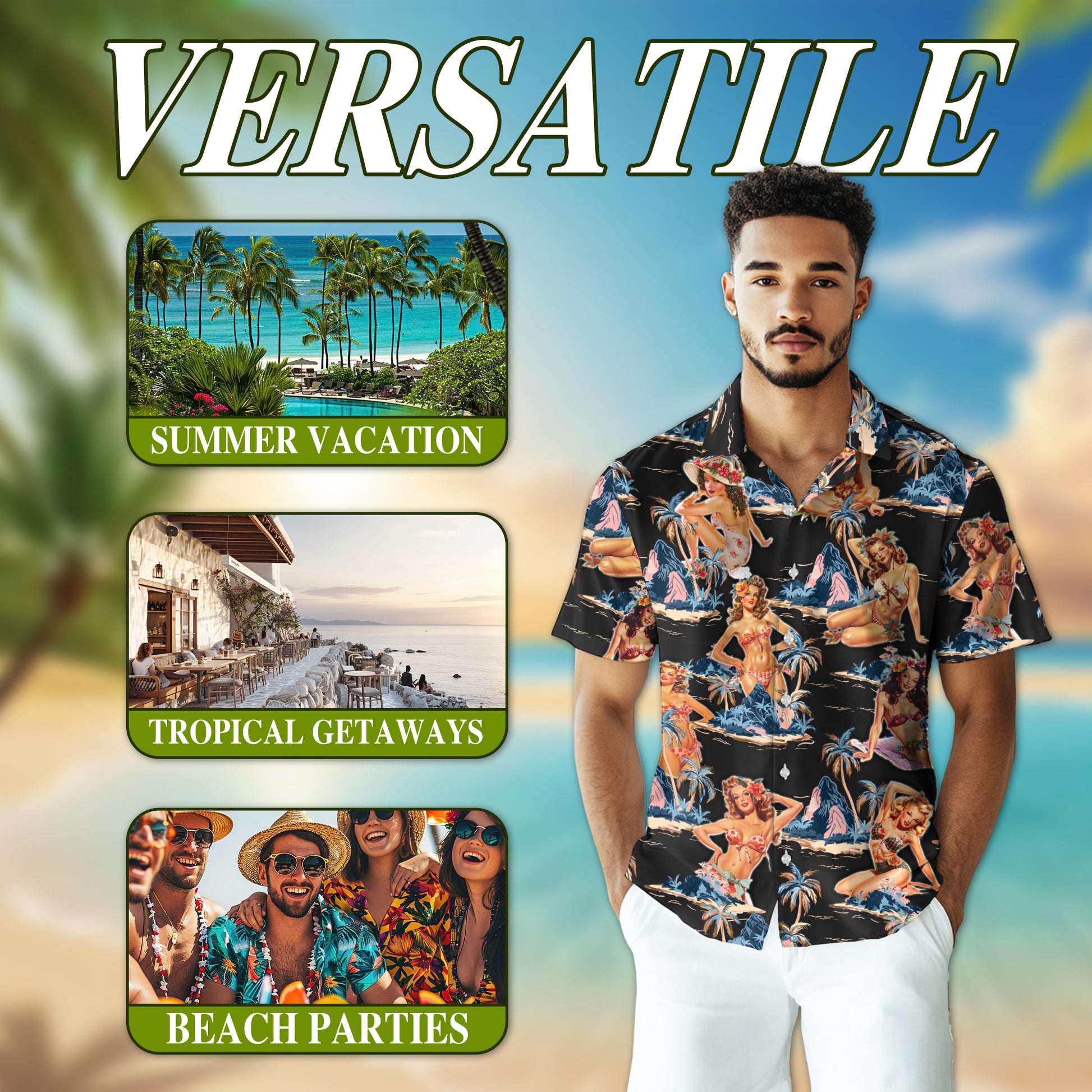 Netecom Tropical Pinup Girl Black Hawaiian Shirt for Men Women, Beautiful Girl Button Down Summer Beach Shirts