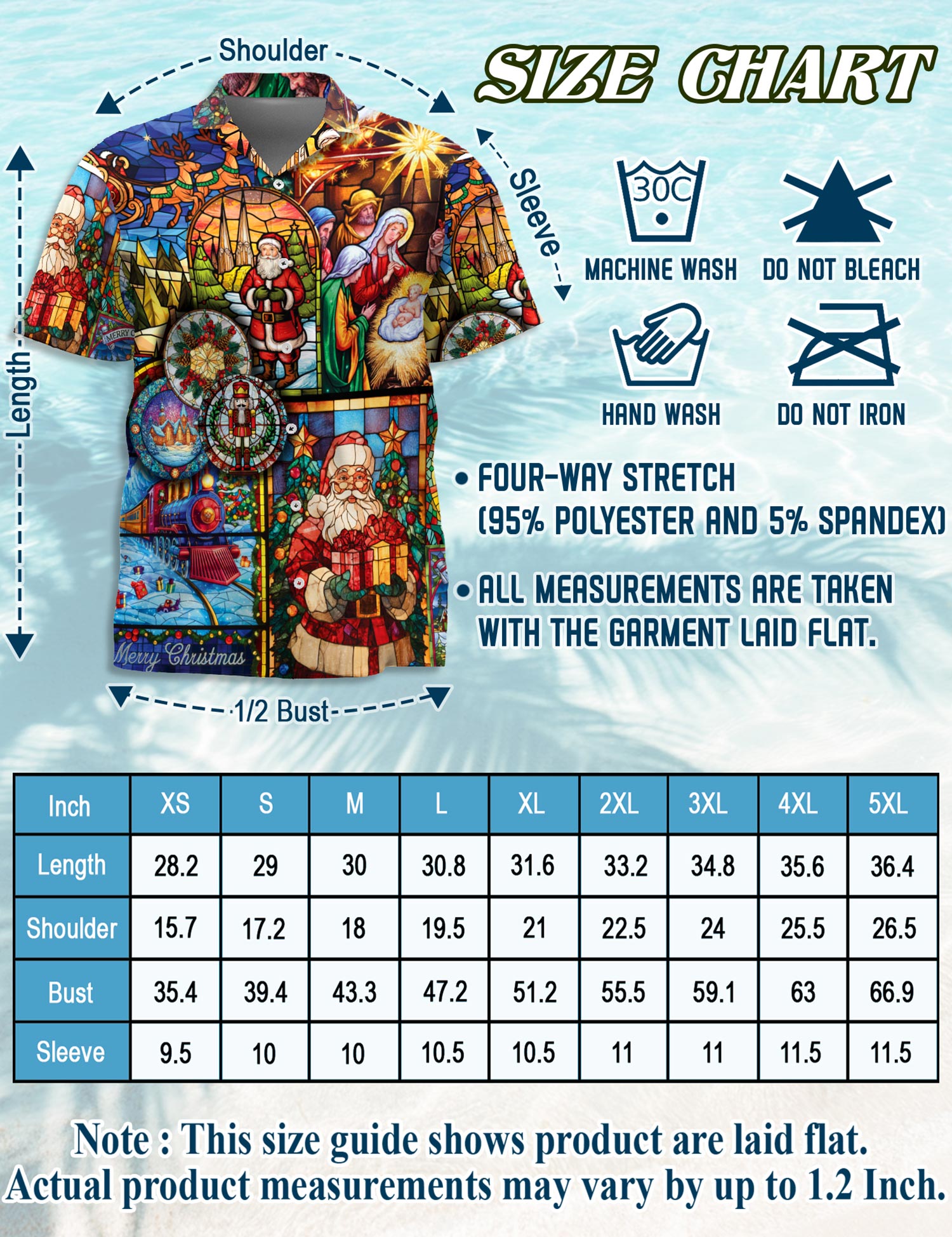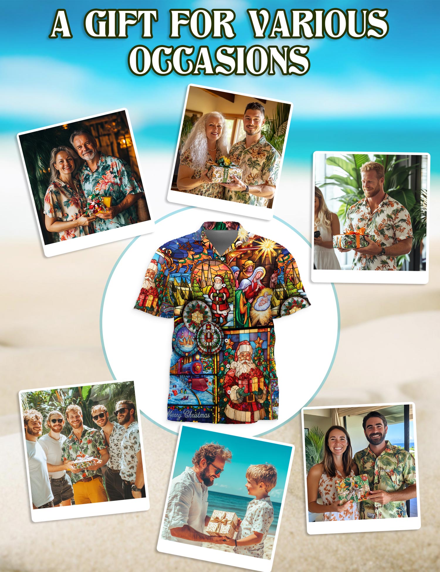 Netecom Christmas Stained Glass Hawaiian Shirt for Men, Nativity Scene Santa Claus Aloha Button Down Summer Beach Shirt, S-5XL