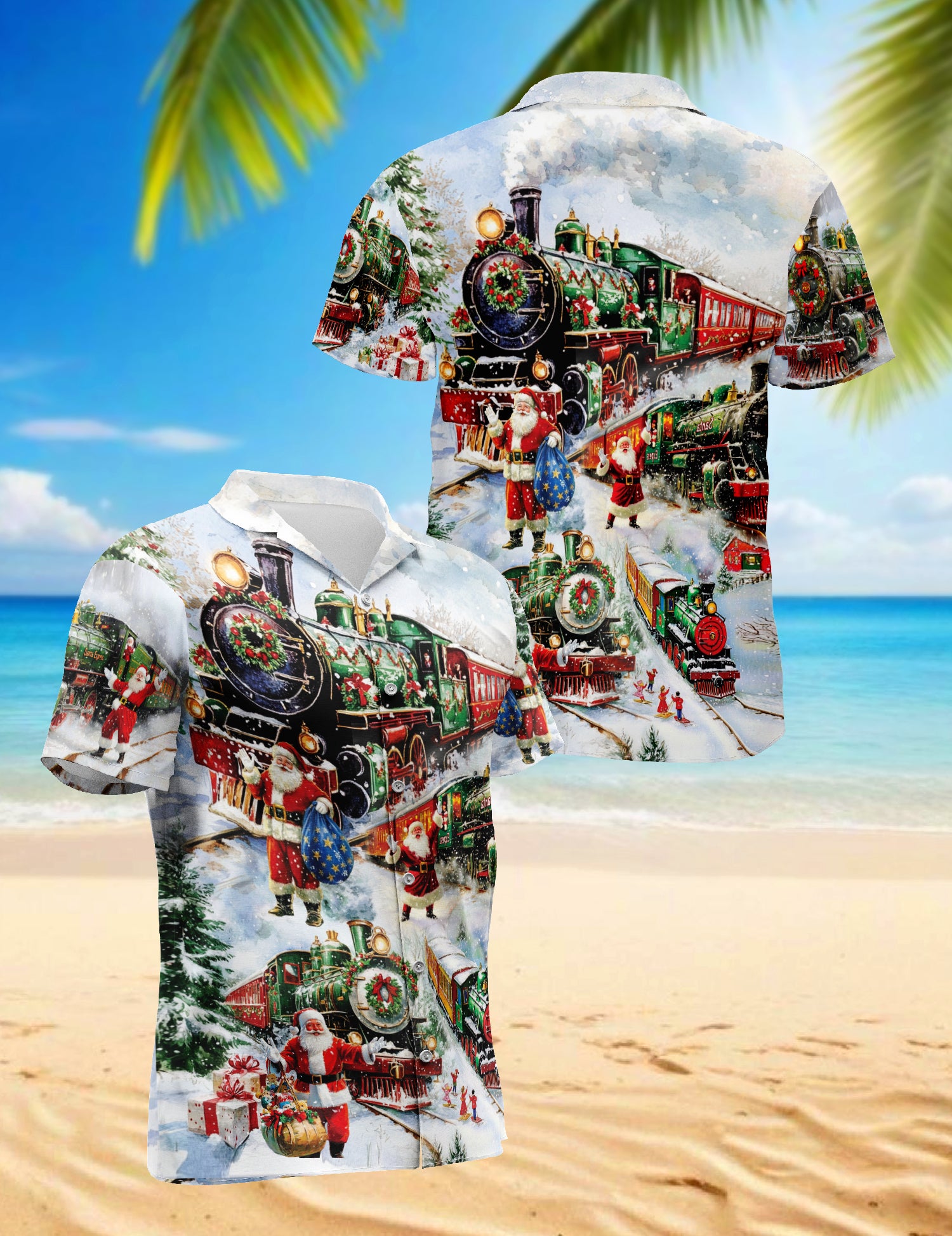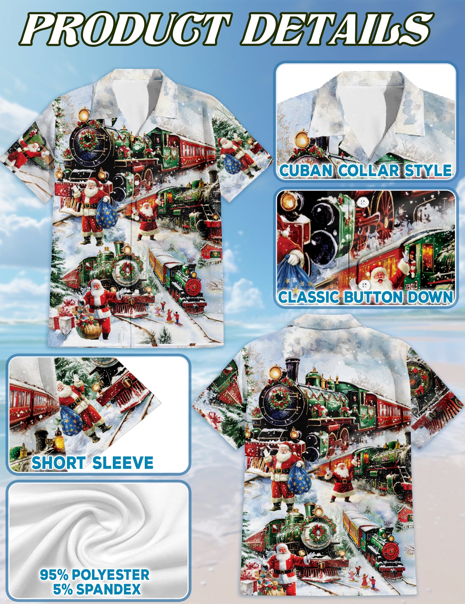 Netecom Christmas Train Hawaiian Shirt for Men, Vintage Santa Claus Winter Print Button Down Summer Beach Shirts