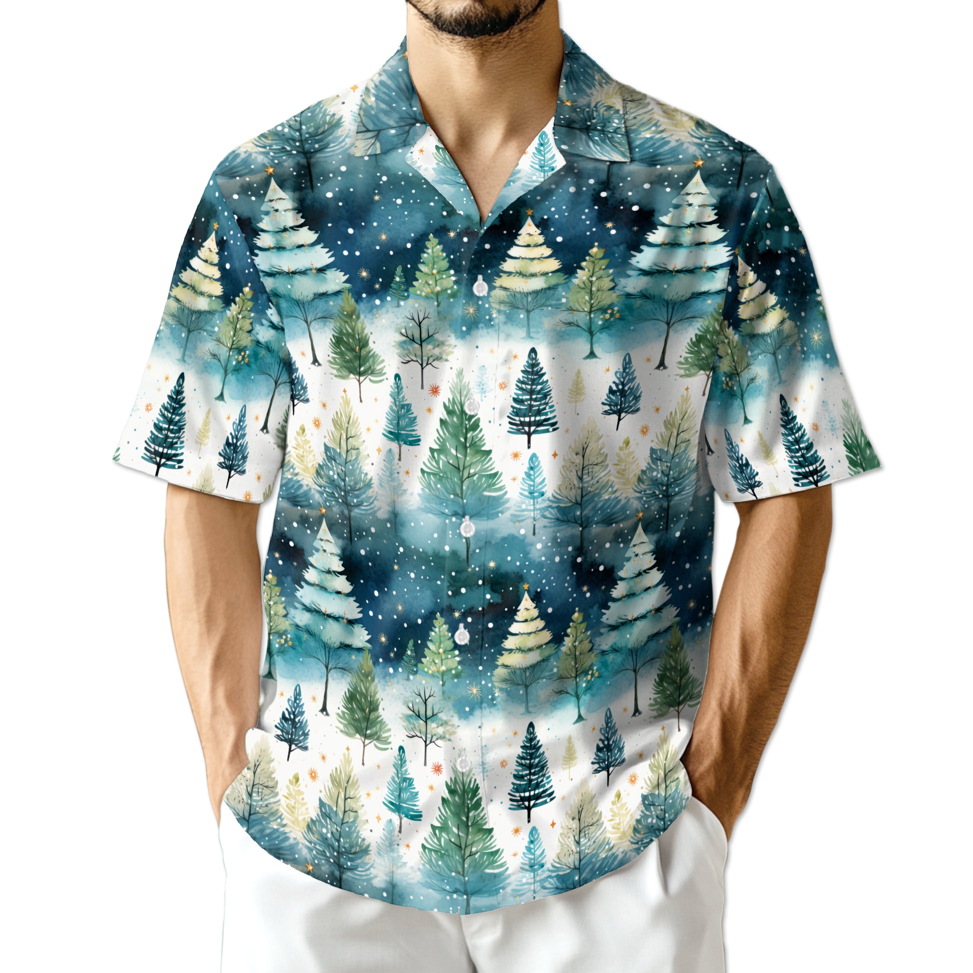Netecom Christmas Tree Hawaiian Shirt for Men, Festive Holiday Pine Forest Button Down Summer Beach Short Sleeve Shirt
