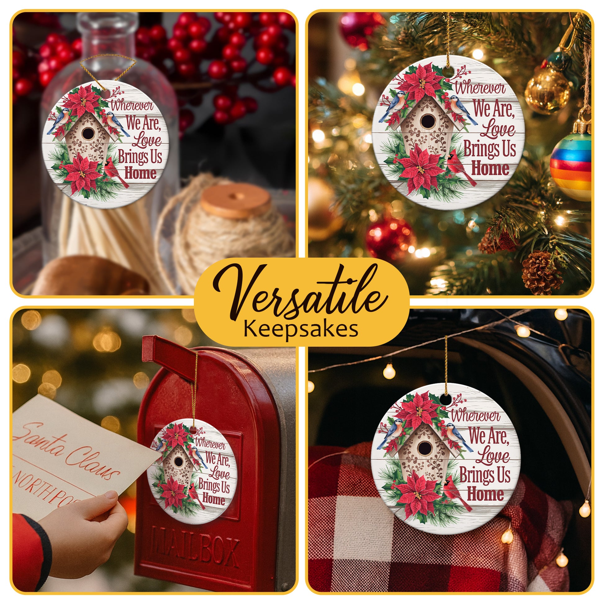 Netecom Classic Birdhouse Ornament with Red Poinsettia and Birds, Wherever We Are Love Brings Us Home Ceramic Ornament for Christmas Tree Hanging Decorations Gift, Home Decor, Holiday Present
