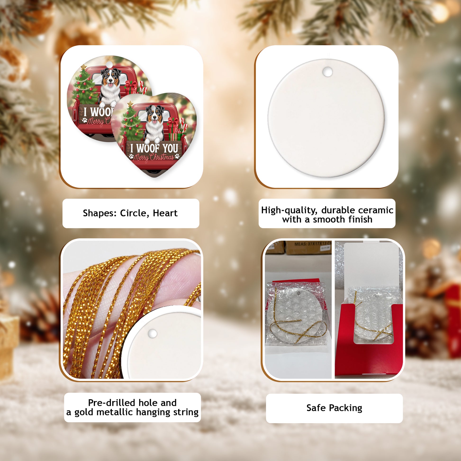 Netecom Cute Australian Shepherd in Holiday Truck Ornament, I Woof You Merry Christmas Ceramic Ornament for Christmas Tree Hanging Decorations Gift, Pet Lover Gifts, Holiday Decor Present