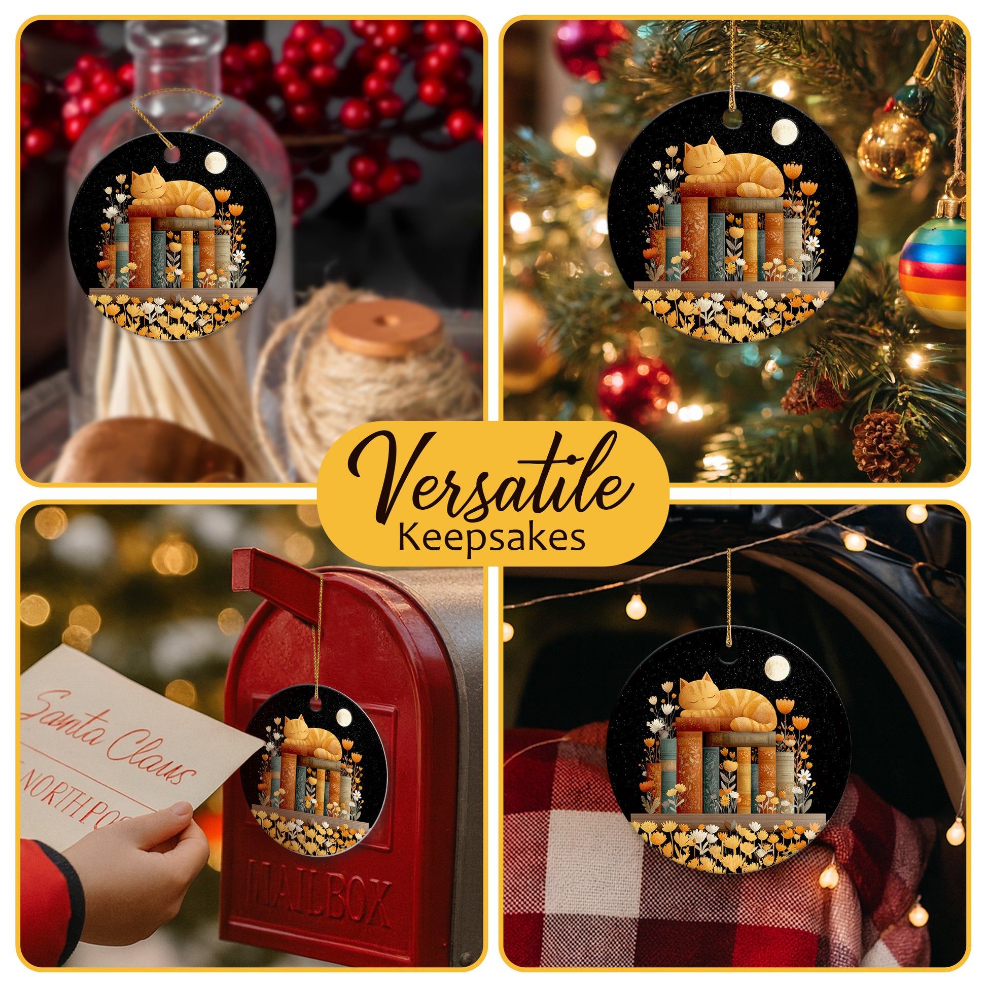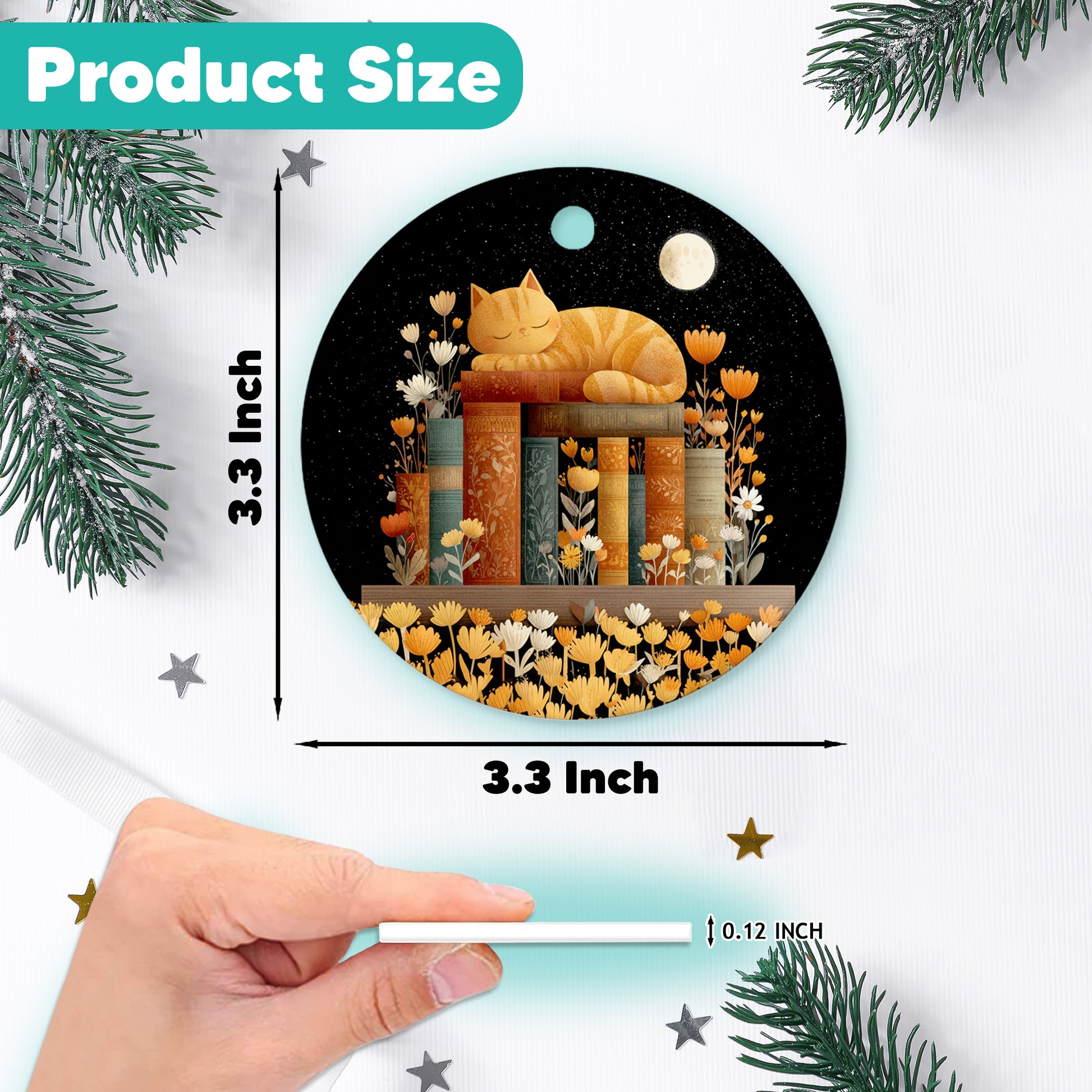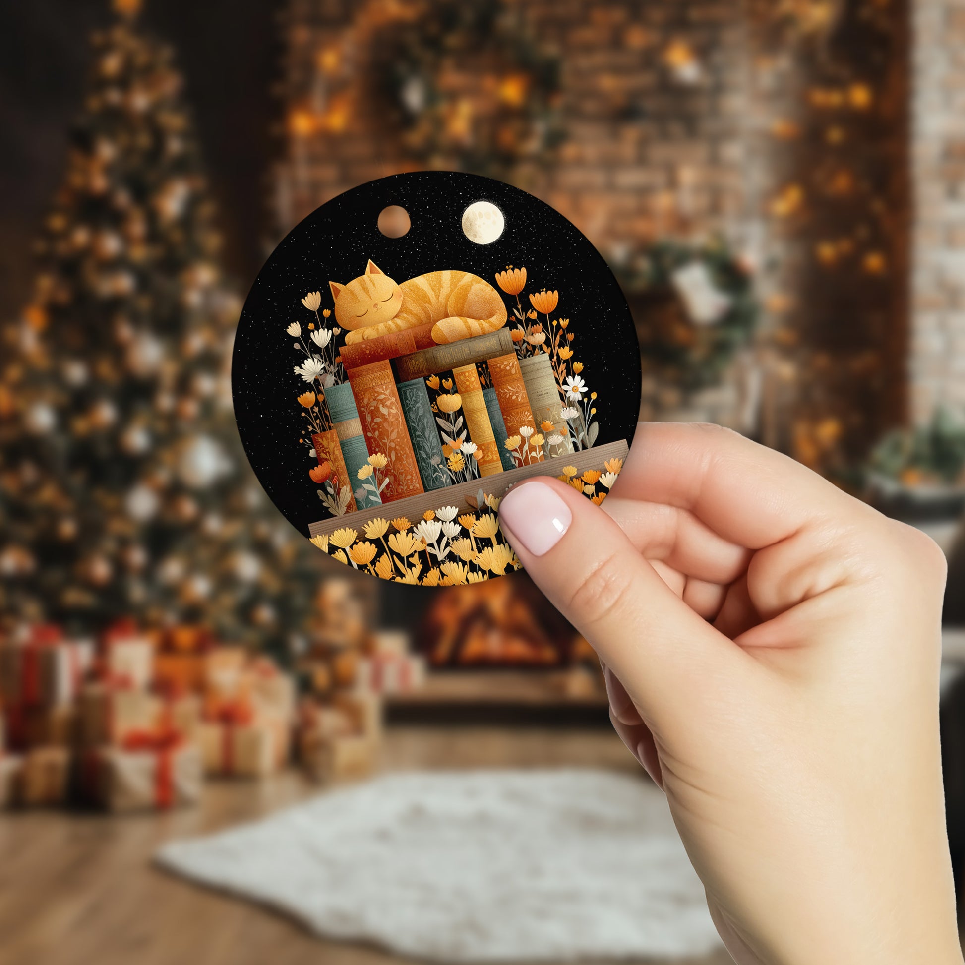 Netecom Cute Cat Sleeping on Books in Night Sky Ornament, Literary Cat Ceramic Ornament for Christmas Tree Hanging Decorations Gift, Book Lover Gifts for Librarian Teacher Bookworm